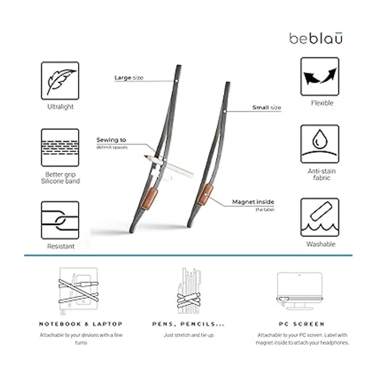 Organizador multifuncional 4 en 1: TWIST funciona como un organizador portátil: unido a tu portátil, iPad, tableta, portátil… cualquier dispositivo… para organizar y llevar tus artículos más importantes. Se convierte en un organizador de escritorio con solo unas pocas vueltas, para sostener bolígrafos, lápices y más: simplemente estira y ata cualquier cosa. Como organizador de pantalla de PC: pégalo a la pantalla de tu PC y sujeta tus auriculares con su imán interior, y como organizador de mochila: mantén todo lo que necesitas a mano y listo para usar