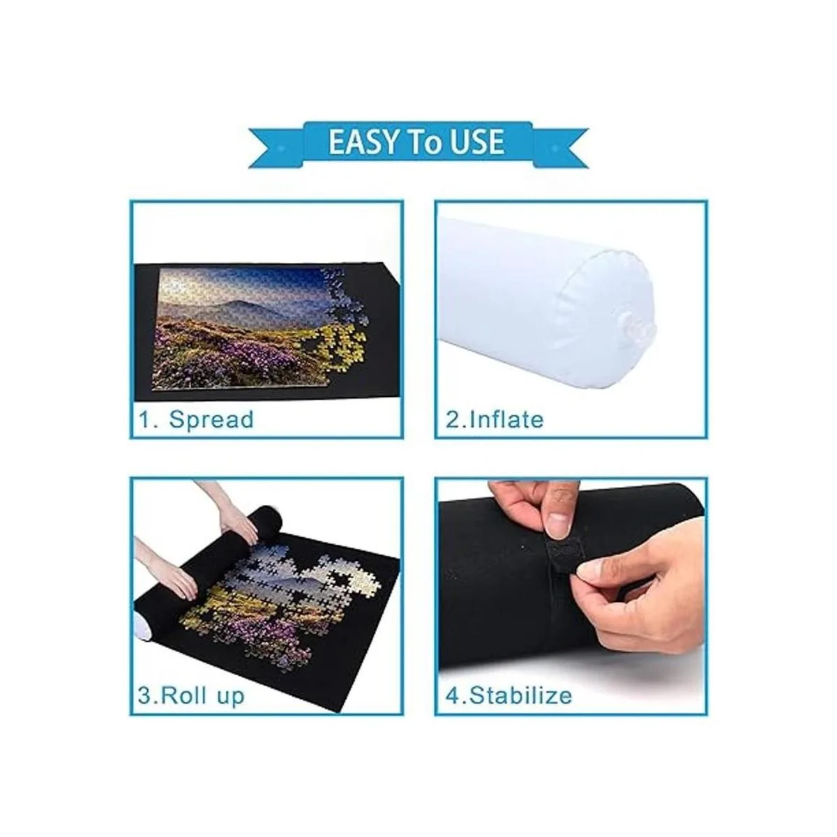 Fácil de usar: extiende y aplana la alfombrilla cuando quieras comenzar tu juego de rompecabezas. Si quieres guardar tu juego sin terminar, simplemente coloca el tubo inflado en cada extremo de la alfombrilla y enrolla cuidadosamente la alfombrilla aplicando una presión uniforme. No olvides apretar ambos extremos con las bandas elásticas para una mayor estabilización.