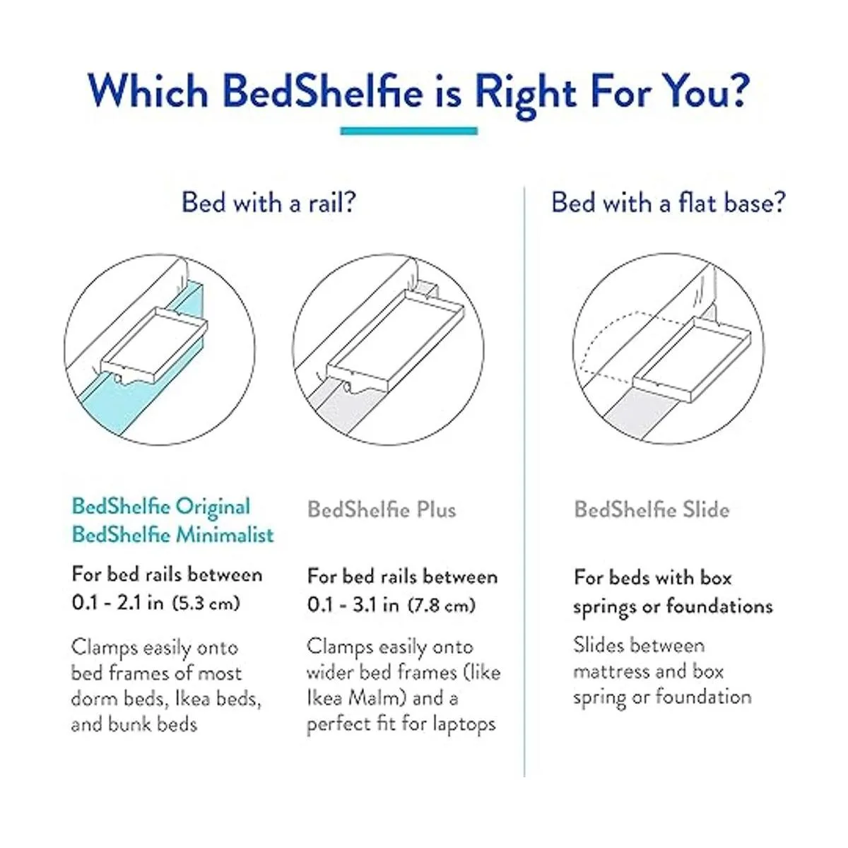 8 estilos, incluyendo los modelos minimalistas y originales abrazadera de 2.1 pulgadas / CableCatch Essential Plus abrazadera de 3.1 pulgadas, que se sujetan a los marcos de la cama con un riel. El modelo Slide está diseñado para camas de somier y camas de plataforma
