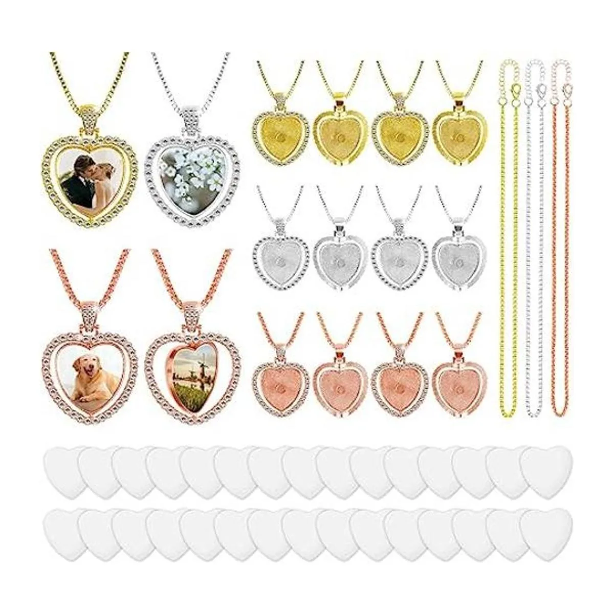 Abundante y más asequible Recibirás 15 colgantes con forma de corazón y 15 collares: 5 colgantes y collares de oro, 5 colgantes y collares de oro rosa, 5 colgantes y collares de plata. Además, hay 30 calcomanías de aluminio por sublimación y 30 cintas de doble cara. Cantidad suficiente, opción más rentable Puedes compartir con tus amigos y familiares y disfrutar de la diversión del bricolaje juntos.