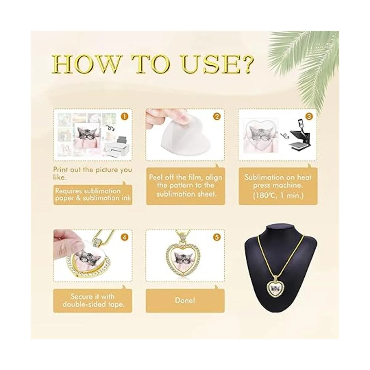 Personalización Imprime tu patrón favorito o foto en papel de sublimación, luego transfiere a una lámina de aluminio por sublimación a alta temperatura tiempo de transferencia térmica recomendado y temperatura: 1 minuto/356.0 F. Las láminas de aluminio por sublimación se pegan a ambos lados del colgante con cinta adhesiva de doble cara. Un collar brillante muy personal te hará destacar entre la multitud