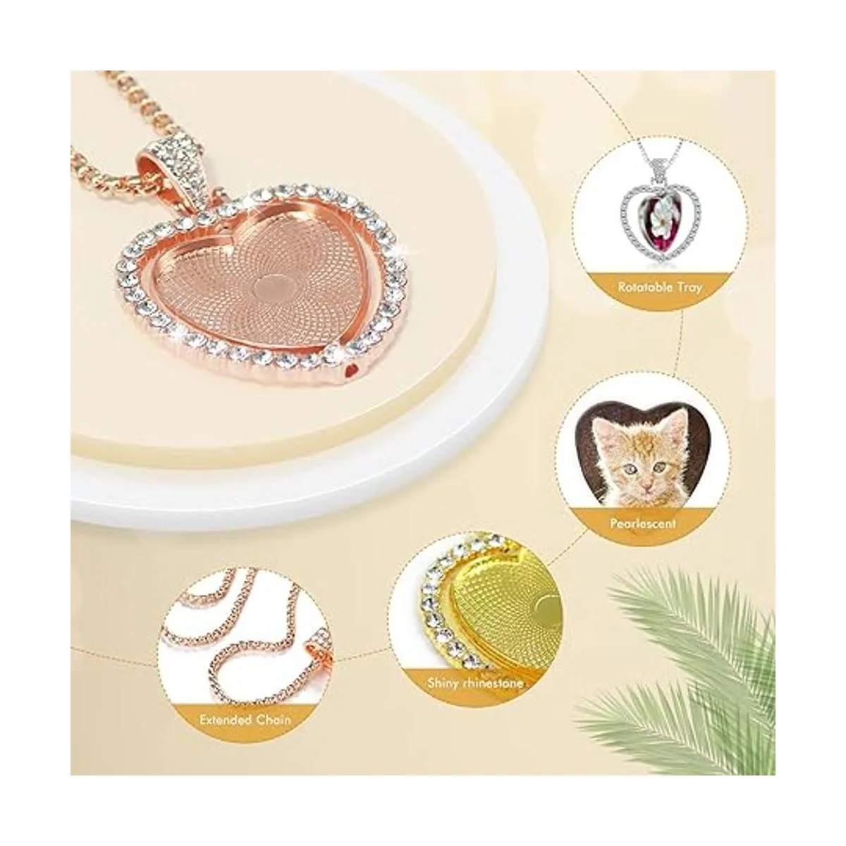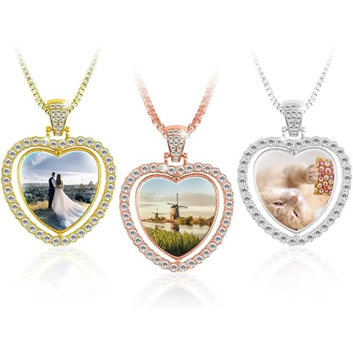 Colgante giratorio de doble cara: cada bandeja colgante en forma de corazón cuenta con un diseño giratorio de dos caras. Muestra 2 fotos personalizadas a la vez y cambia a voluntad La bandeja colgante está disponible en 3 colores diferentes, oro, plata y oro rosa. El anillo exterior del colgante está relleno de diamantes de imitación brillantes, que son clásicos en forma, exquisitos en artesanía, modernos y elegantes, adecuados para todas las ocasiones.