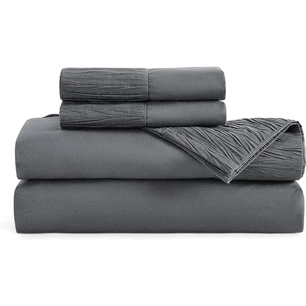 Contenido del paquete: Juego de sábanas de Bedsure. Juego de sábanas con fruncido bordado. Suaves y de microfibra cepillada. Juego de sábanas resistentes a las arrugas. 1 sábana bajera, 1 sábana encimera y 1 funda de almohada, tamaño individual, color gris oscuro.