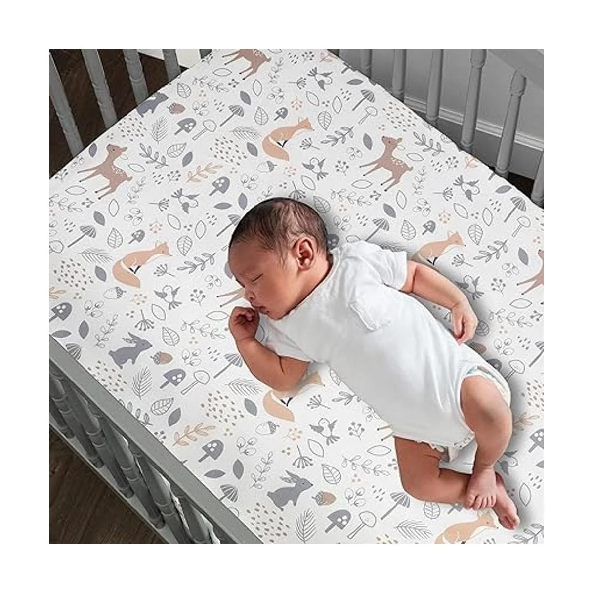 Sábana bajera ajustable para cuna cuenta con un bonito zorro, ciervo dulce, conejo feliz y un montón de hojas y setas