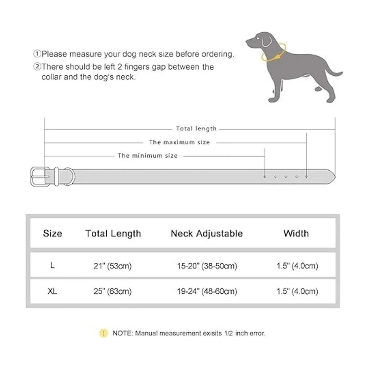 Atención a las tallas: En comparación con los collares demasiado anchos, este collar ajustable de 1.5 pulgadas es más adecuado para tus perros. Talla XL: cuello de 19 a 24 pulgadas, ancho de 1.5 pulgadas. Collar de perro XL para perros grandes y extragrandes, como Akita, perro de montaña bernesa, Doberman Pinscher, Dogo Argentino, Pastor Alemán, Golden Retriever, Labrador, Gran Danés, Lobo Irlandés, Husky Siberiano, Wheaten Terrier, etc. Asegúrate de medir el cuello de tu perro antes de realizar el pedido.