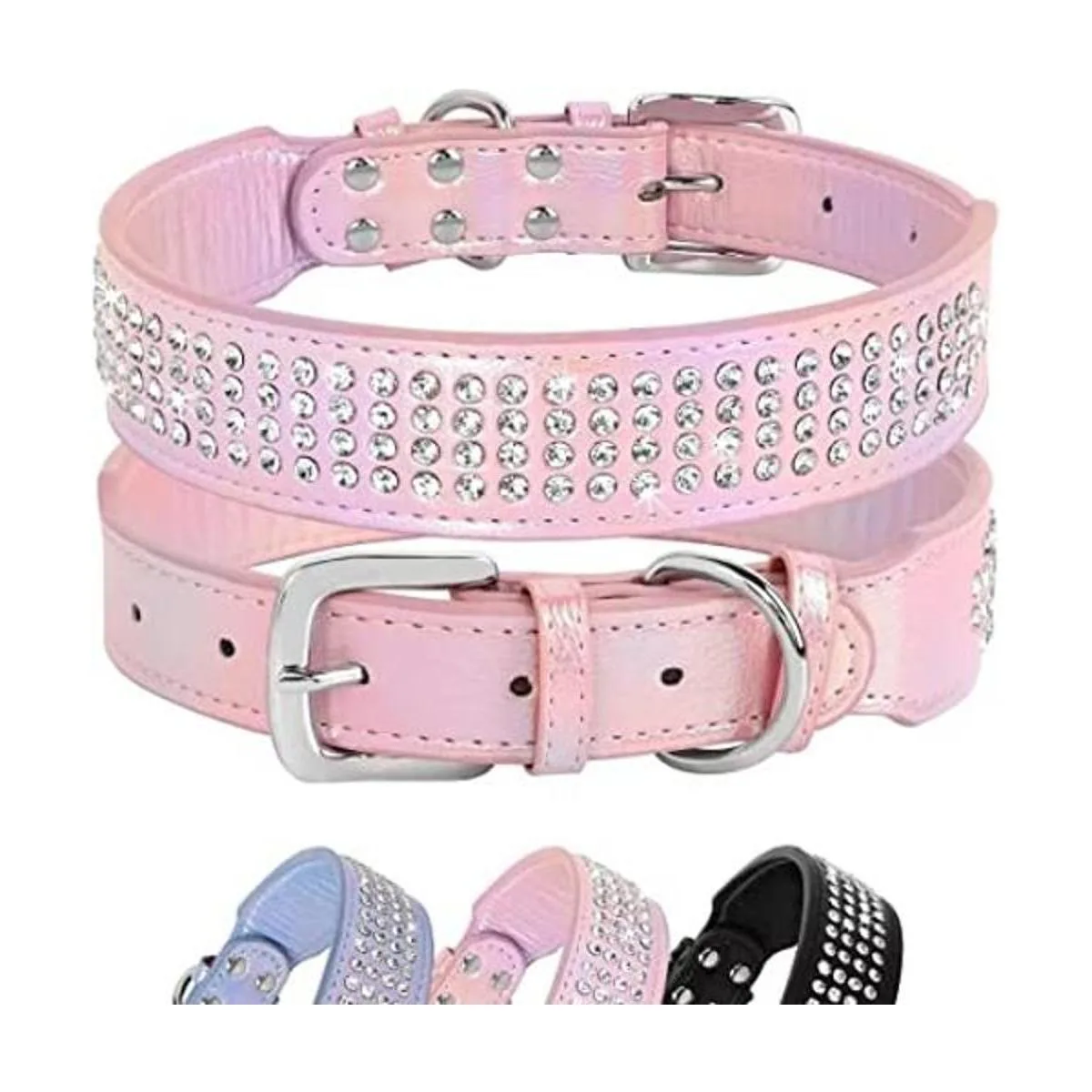 Beirui Collar de perro con diamantes de imitación brillantes con tachuelas Collar de perro acolchado de piel sintética colorido de 1.5 pulgadas de ancho Collar de perro deslumbrante resistente para perros medianos y grandes, 1924 pulgadas, rosa