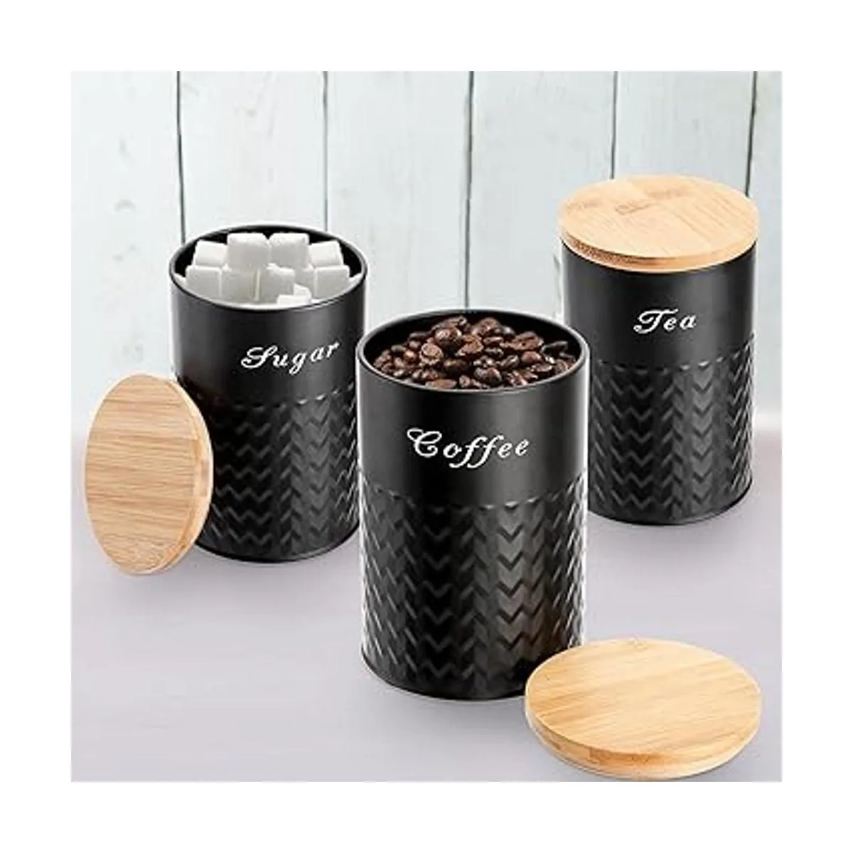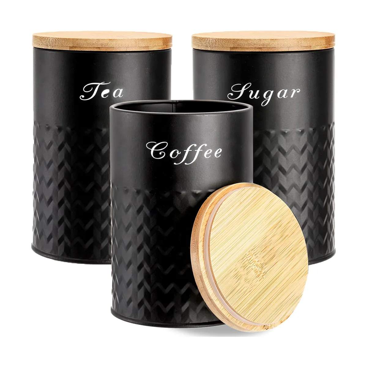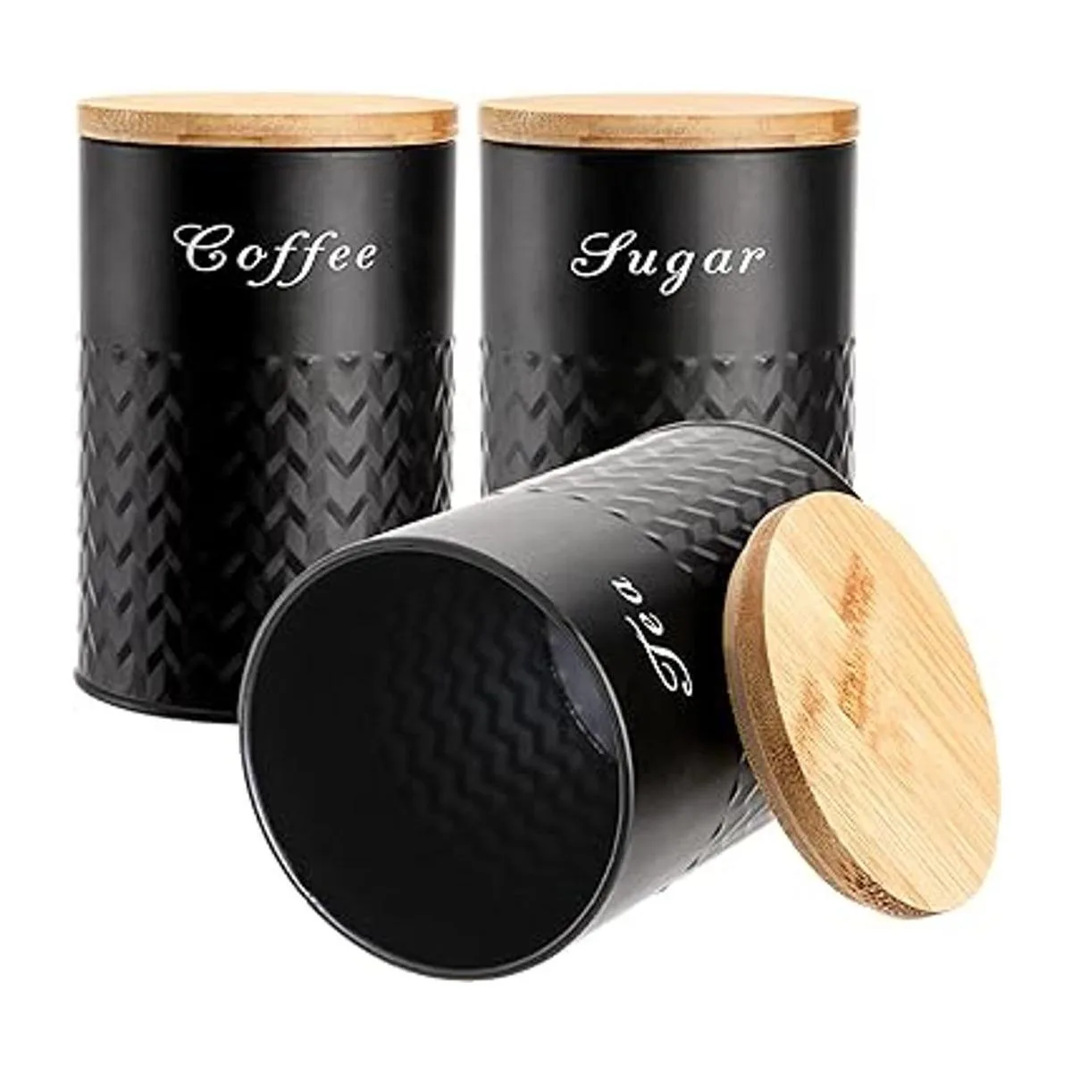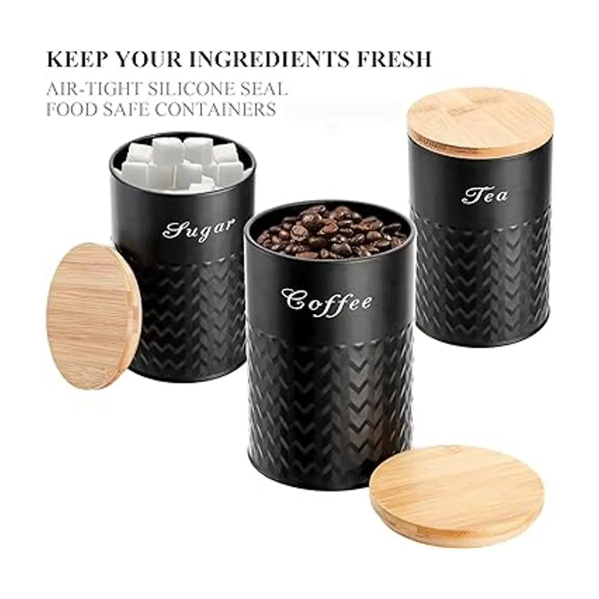 Bekith Paquete de 3 recipientes de cocina con tapas de bambú, juego de recipientes de metal herméticos, tarros de almacenamiento de alimentos para café, azúcar, té, harina, contenedores de decoración de cocina rústicos, color negro