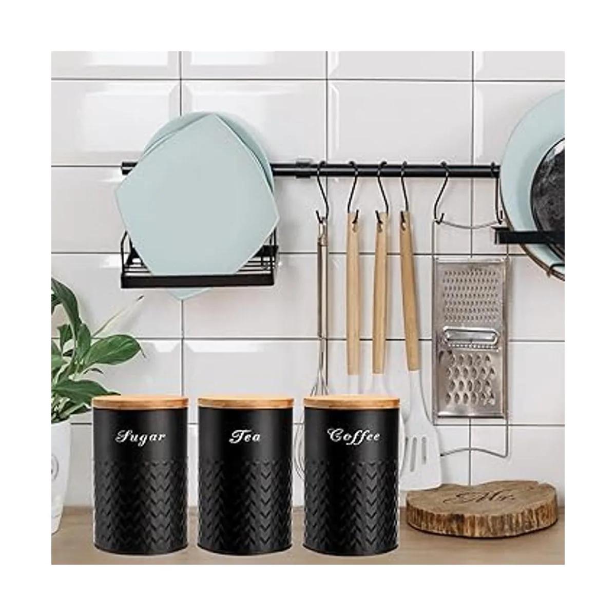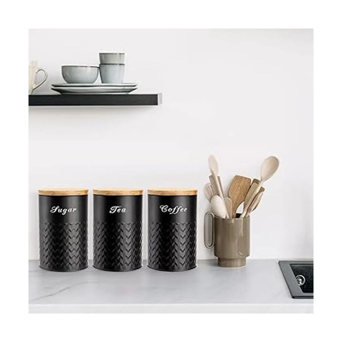 Juego de recipientes de cocina de metal: un juego de 3 recipientes decorativos de cocina negros que son ideales para sostener azúcar, café o té. Llamativas decoraciones de cocina que se verán hermosas mostradas en un estante de cocina, bar o encimera.