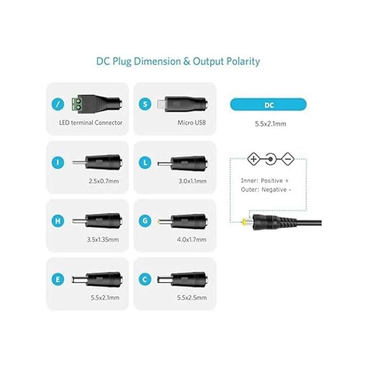 Esta salida del adaptador de corriente es de 5 V, 6 V, 7,5 V, 9 V, 12 V, 13,5 V, 15 V, 3000 mAh, 3 A máx. 45 W. Compatible con adaptadores de corriente de 5 W, 10 W, 12 W, 24 W, 30 W, 36 W y más de 45 W.