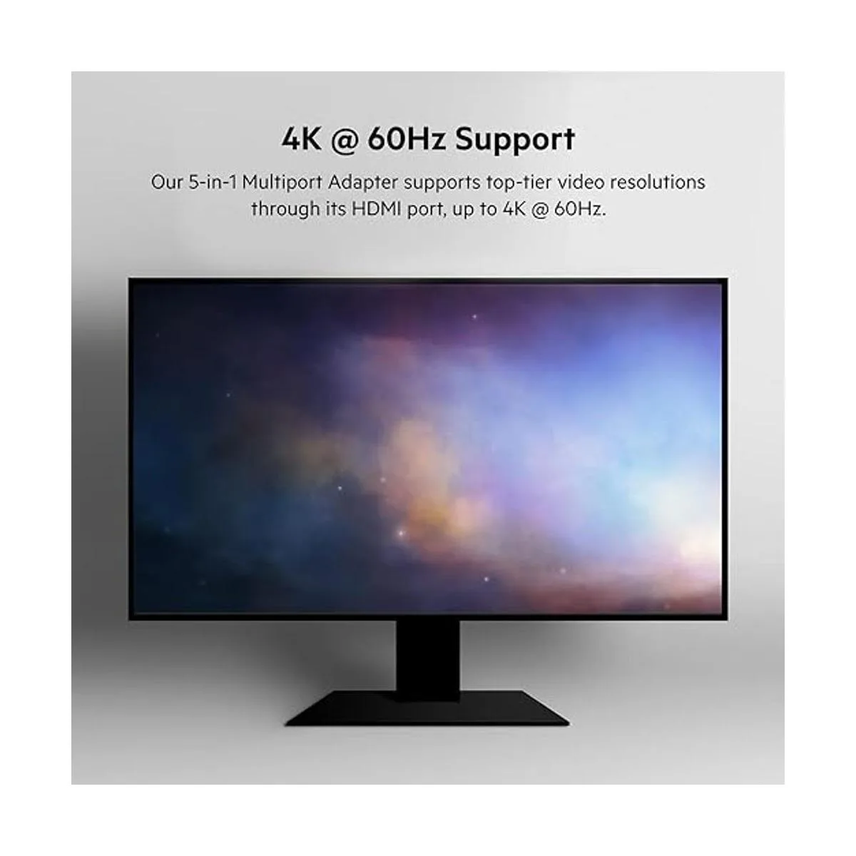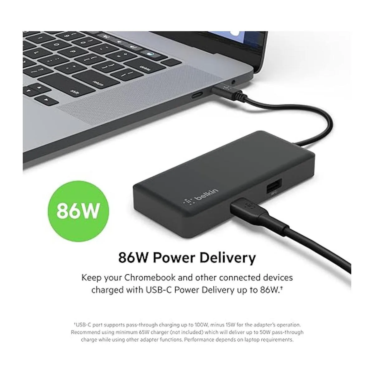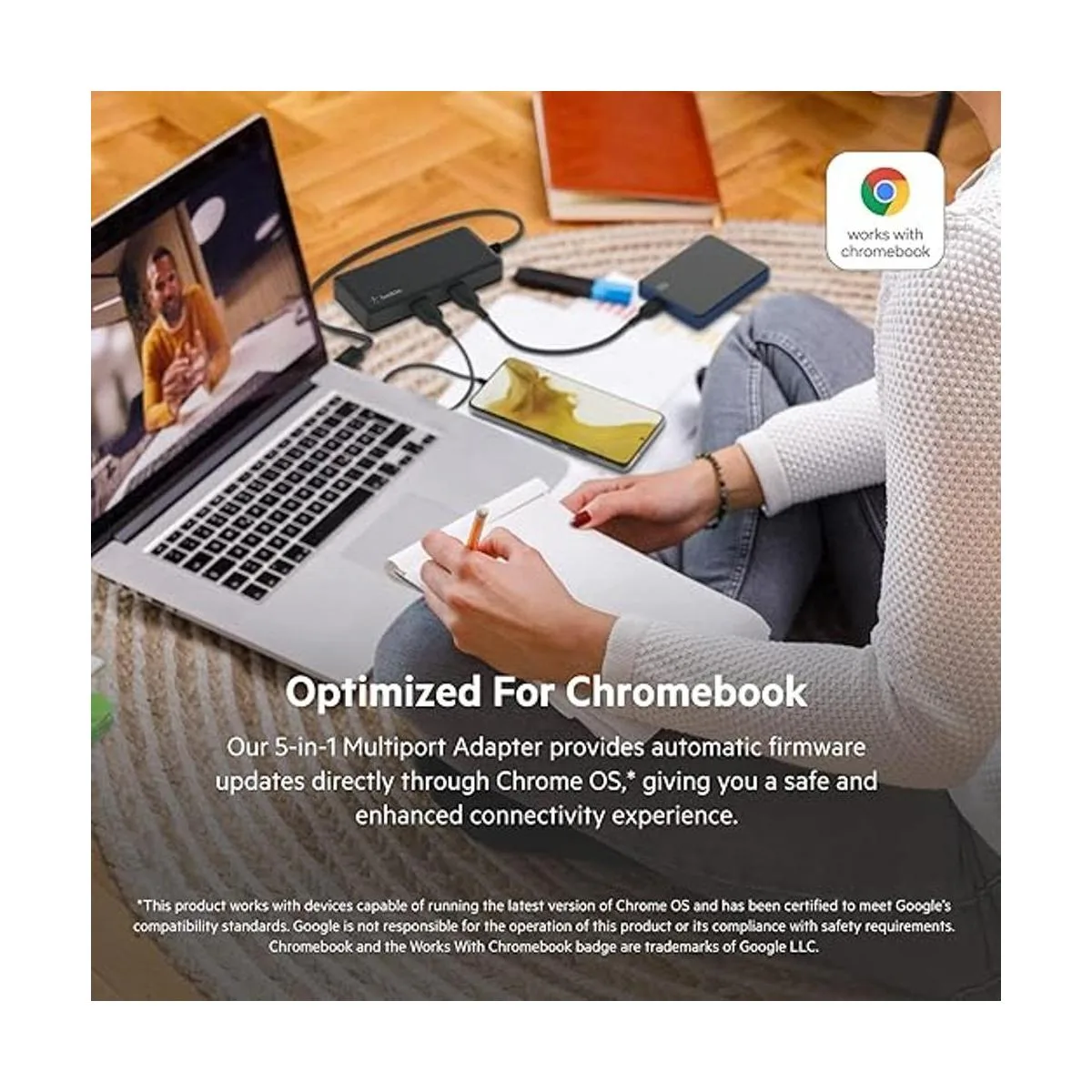 Belkin Adaptador de concentrador multipuerto 5 en 1 optimizado para Chromebook con puerto HDMI 4K 60Hz, USB tipo C 86W, Gigabit Ethernet, 2 USB A 3.1 Gen 1 y pequeño, portátil, tamaño compacto