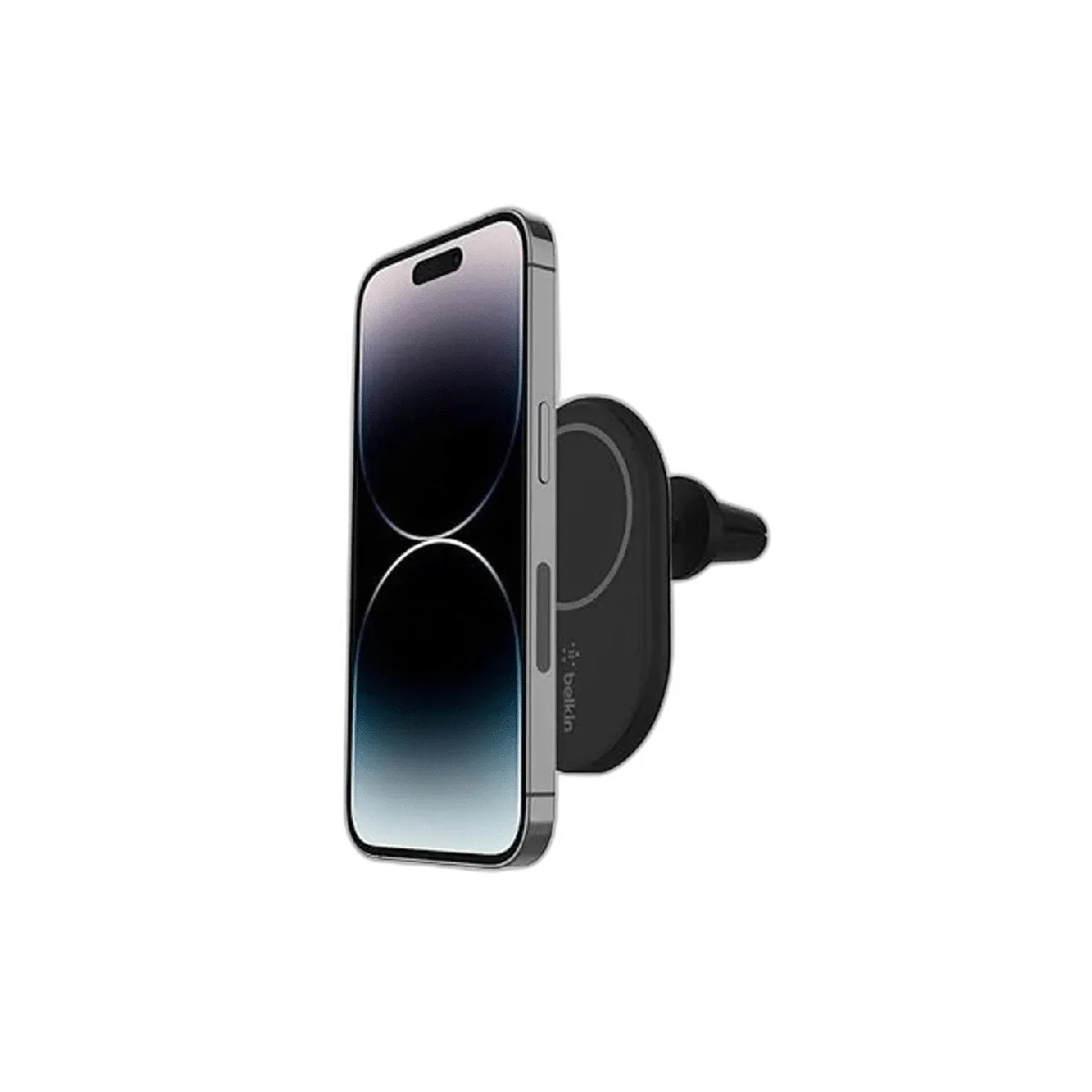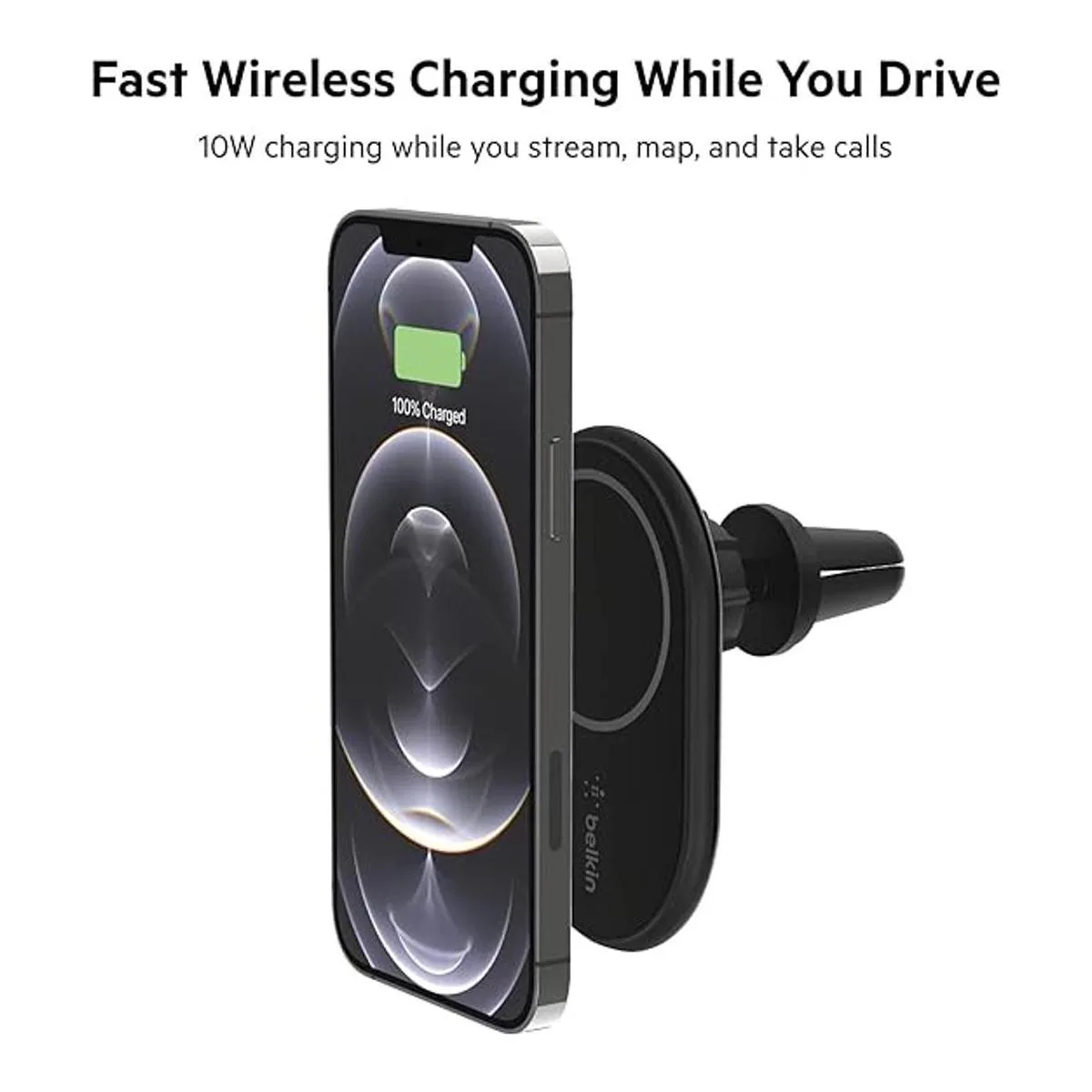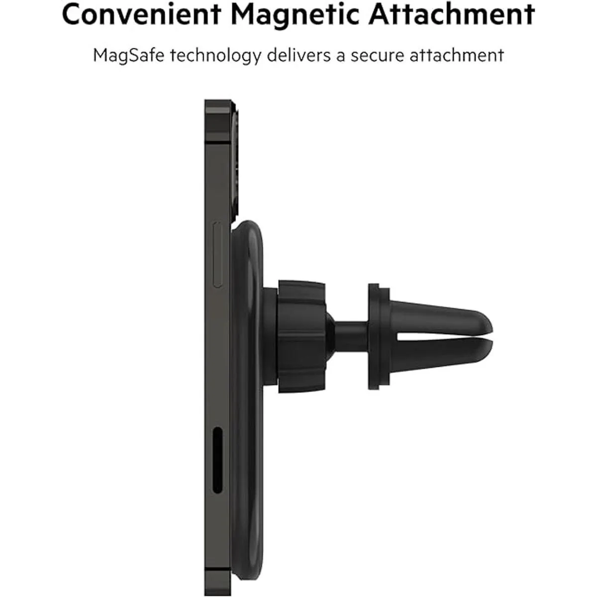 Belkin Cargador inalámbrico magnético para automóvil, cargador inalámbrico compatible con MagSafe, soporte de ventilación de aire con fuente de alimentación incluida para iPhone 14, iPhone 13 y iPhone 12, cargador magnético de montaje para teléfono para automóvil
