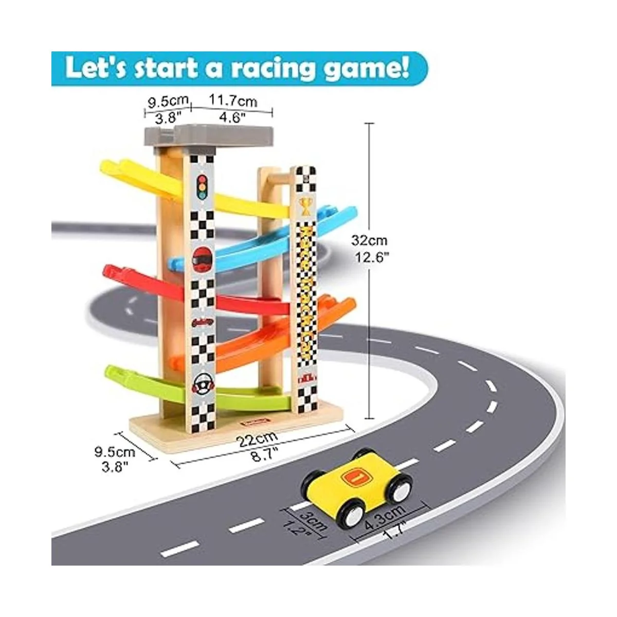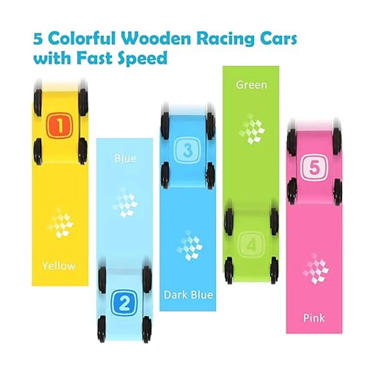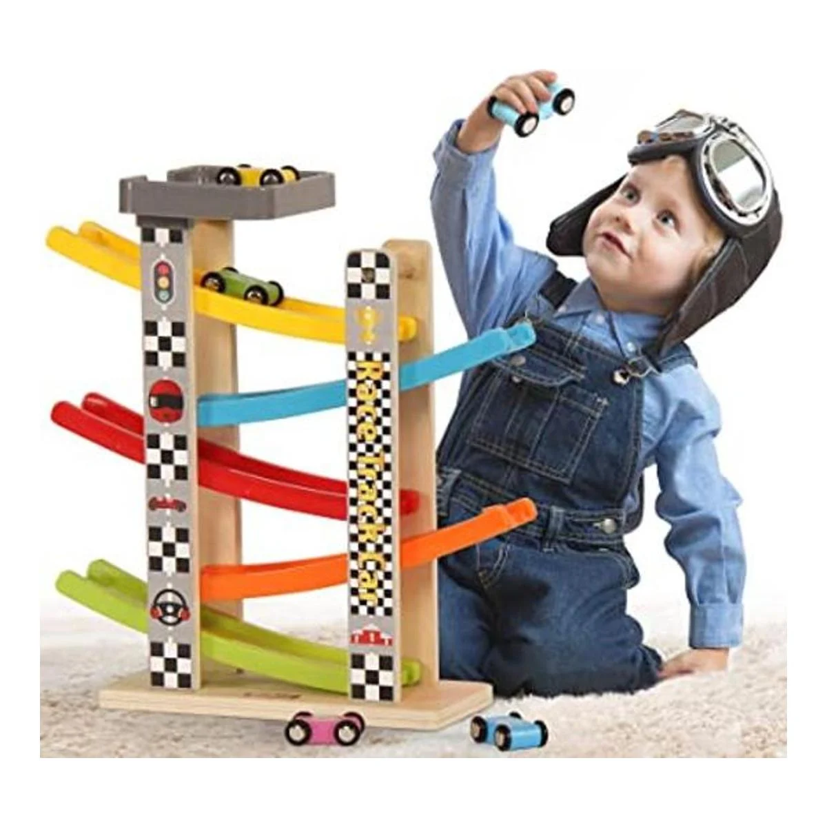 Belleur Juguete Montessori para niños y niñas de 1 a 3 años, coche de pista de carreras de madera para niños, juego de carreras de rampa para niños pequeños con 5 mini autos y 5 rampas, perfecto para regalos de cumpleaños de bebés