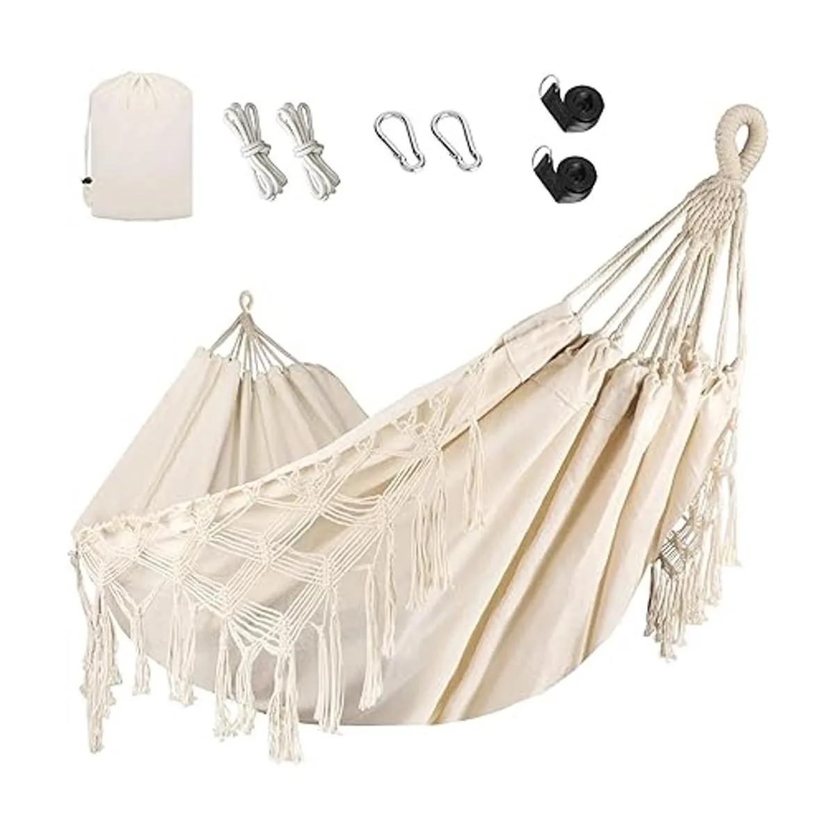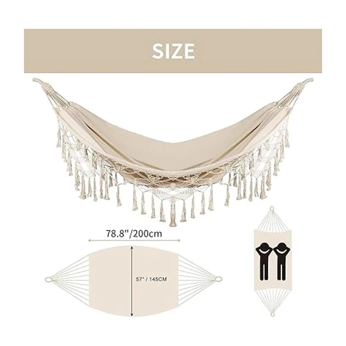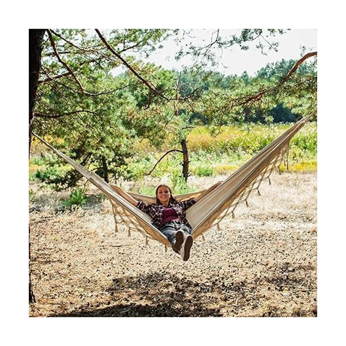 Bellzacasa Hamaca doble, borlas resistentes de capacidad de carga de 500 libras y tejido de cola de pez con correas de montaje para acampar al aire libre, balcón, patio, color beige