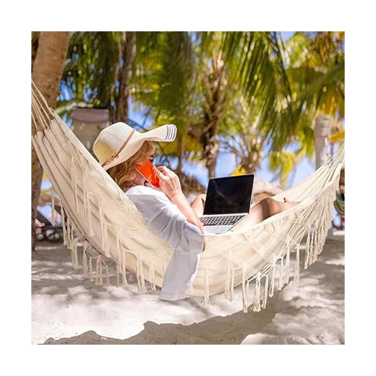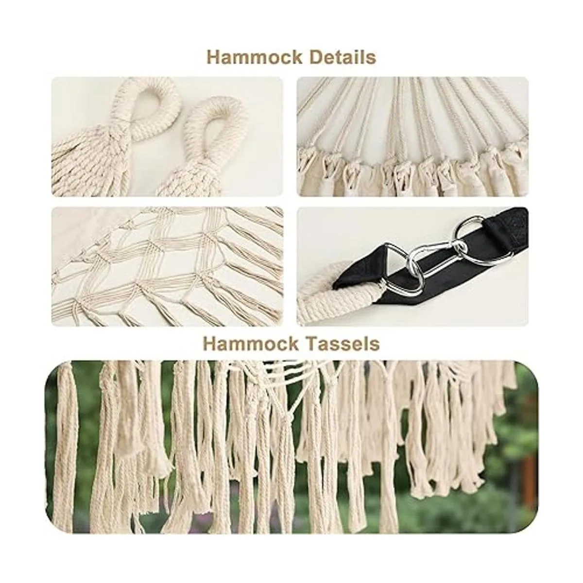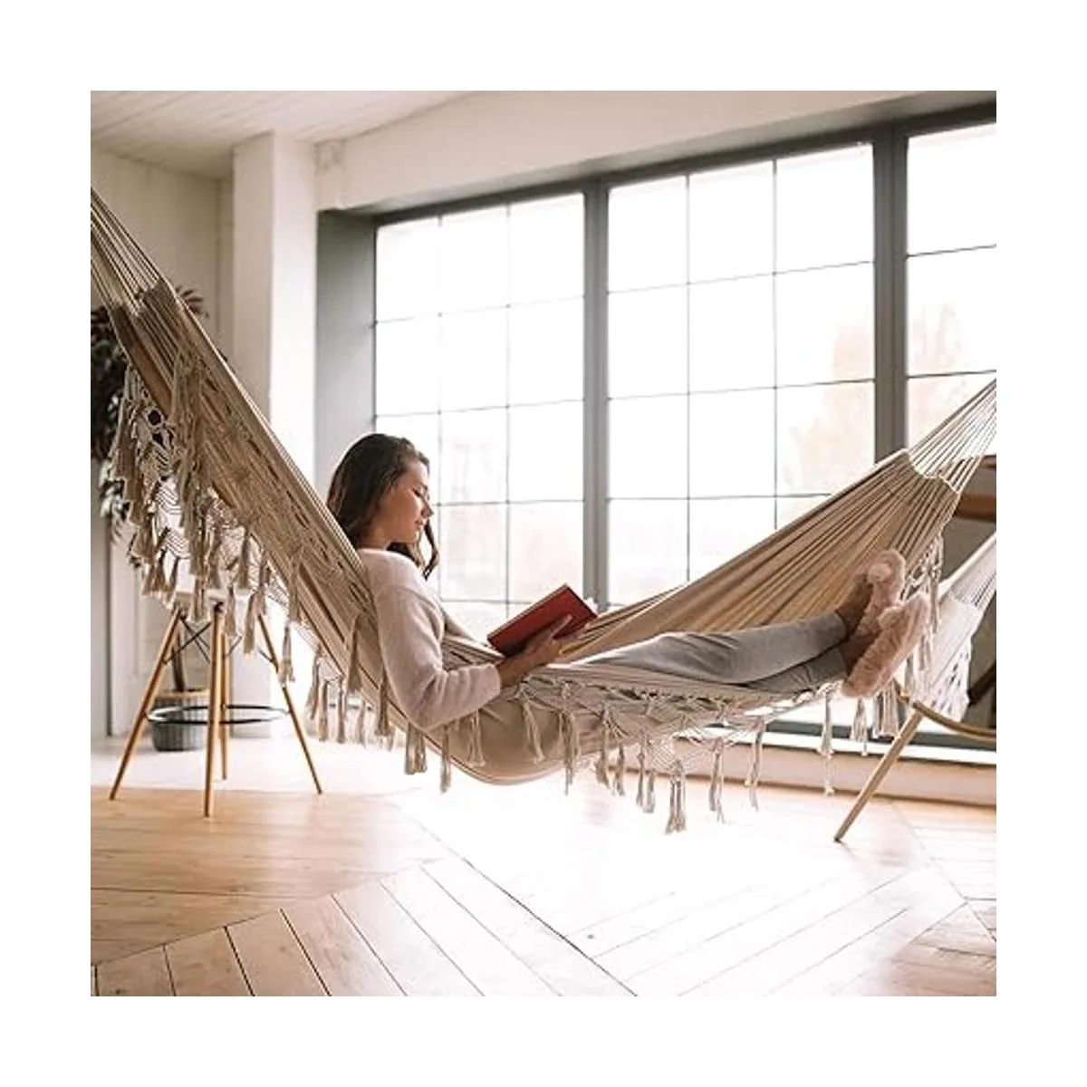 Bellzacasa Hamaca doble, borlas resistentes de capacidad de carga de 500 libras y tejido de cola de pez con correas de montaje para acampar al aire libre, balcón, patio, color beige