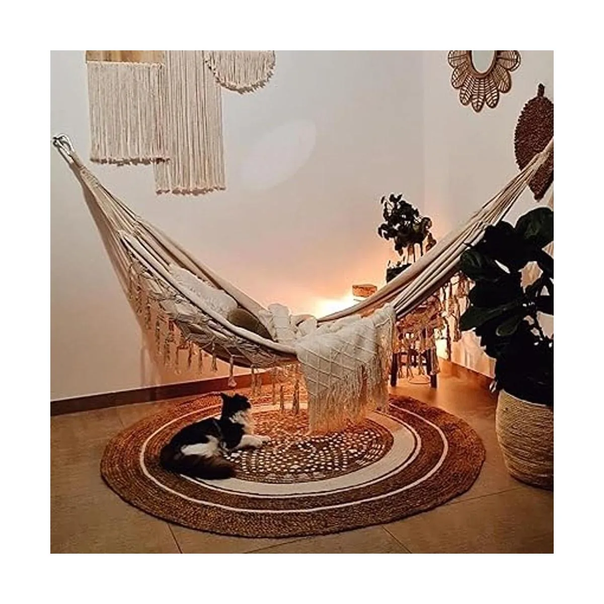 Un elegante diseño de borlas colgantes en los lados hace que nuestra hamaca se vea muy llamativa. Imagina que estás tumbado en esta elegante hamaca en tu jardín o en la playa, el sol se pone, amigos y familiares están a tu alrededor, qué escena