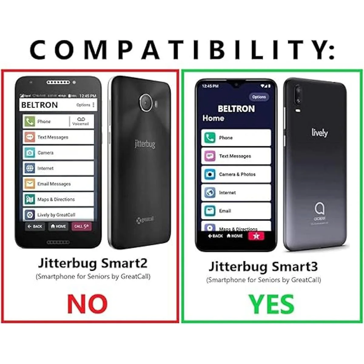 El combo de funda y funda BELTRON cuenta con un perfil superdelgado, acabado de agarre de goma y recortes de botón abiertos para un fácil acceso a todas las funciones y controles de tu GreatCall Jitterbug Smart3 Vively Smart. No es compatible con el Jitterbug Smart2.