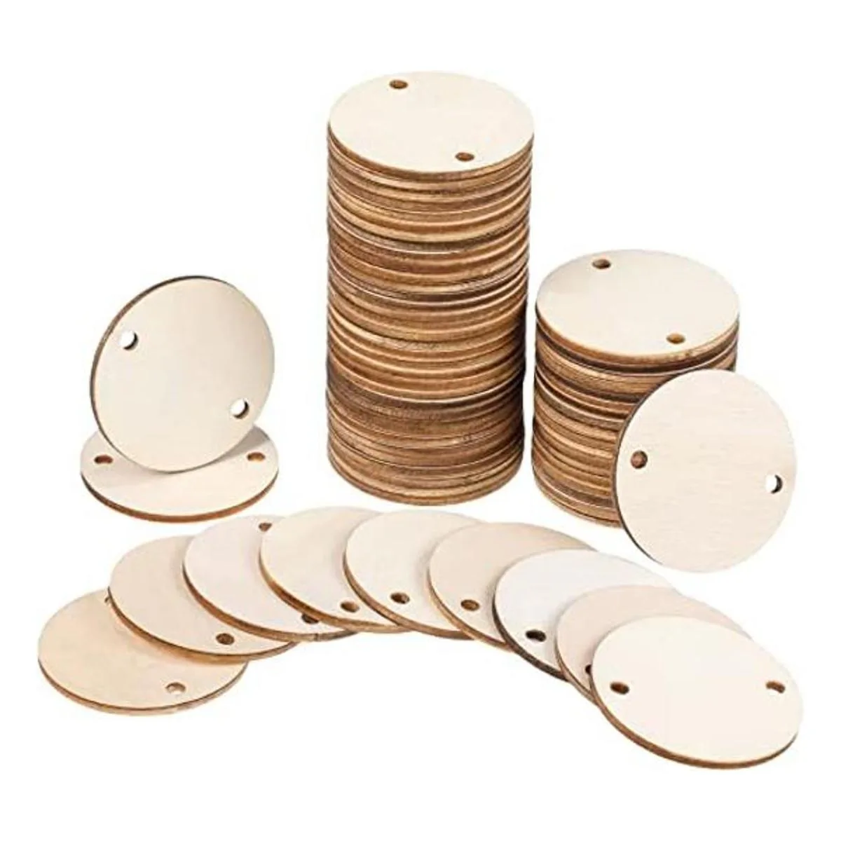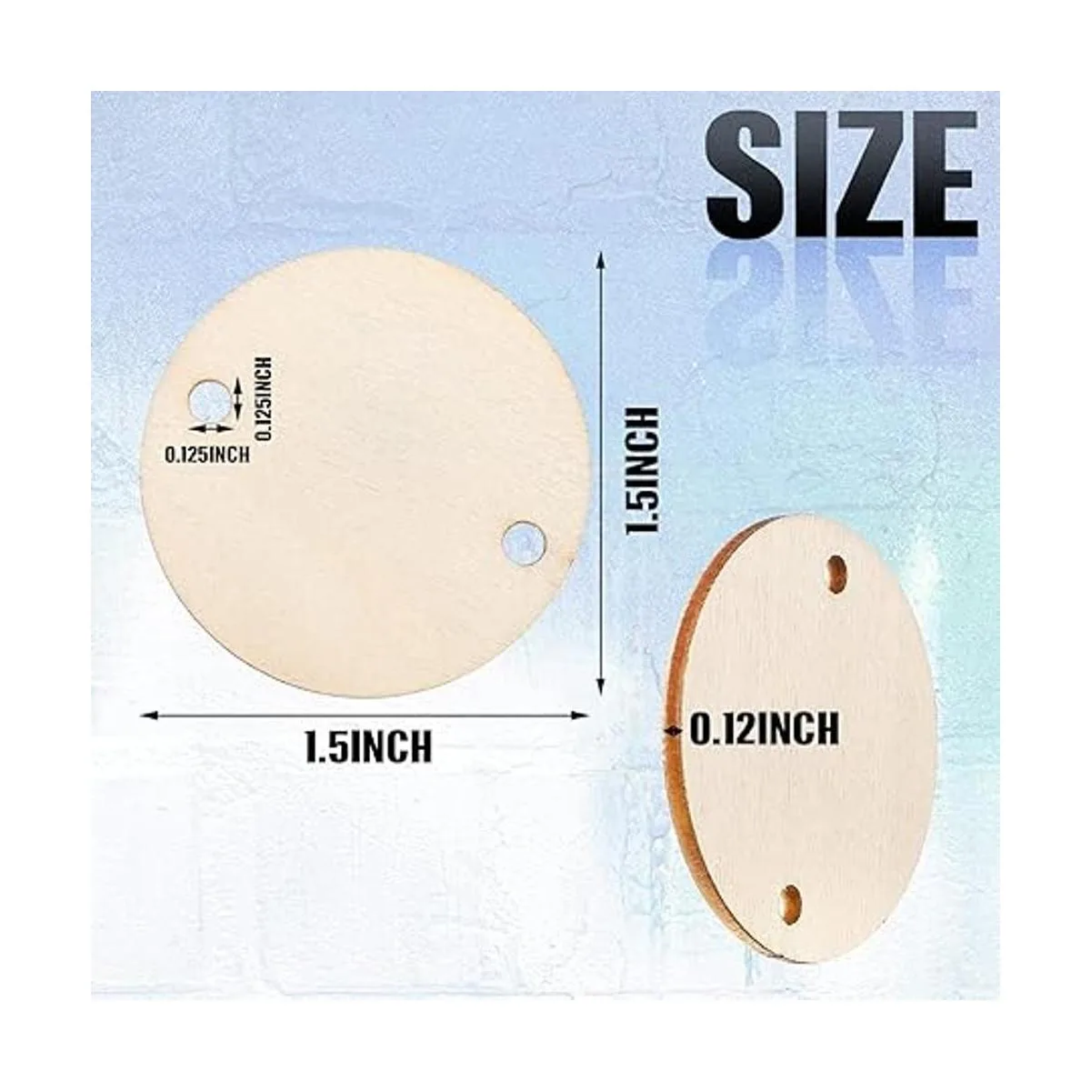 Tamaño: las etiquetas circulares de madera miden 1.5 in de diámetro, 0.1 in de grosor, el diámetro de los agujeros es de 0.1 in