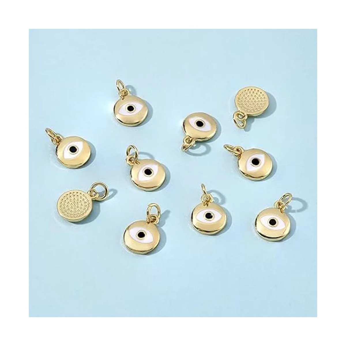 El paquete incluye: 10 colgantes de mal de ojo. Tamaño: 0.394 in de ancho, 0.492 in de largo, 0.079 in de grosor; anillo de salto: 0.197 in de diámetro, 0.039 in de grosor, orificio de 0.118 in.