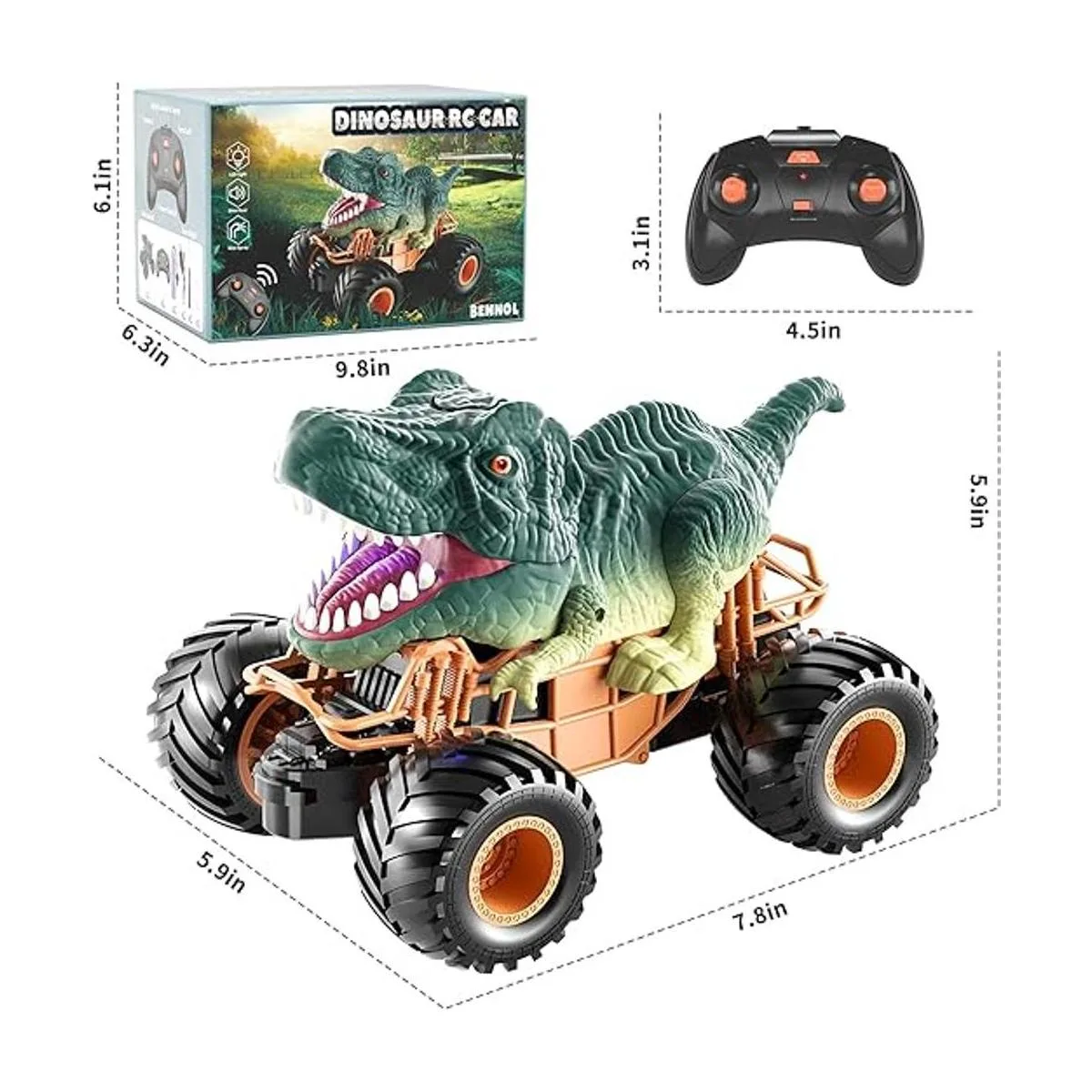 Bennol Auto de dinosaurio con control remoto para niños de 4 a 7 años, 2.4 GHz, juguete de camión de dinosaurio RC para niños pequeños, juguete eléctrico de coche RC con función de pulverización de luz y sonido para niños de 3, 4, 5, 6, 7, 8 años