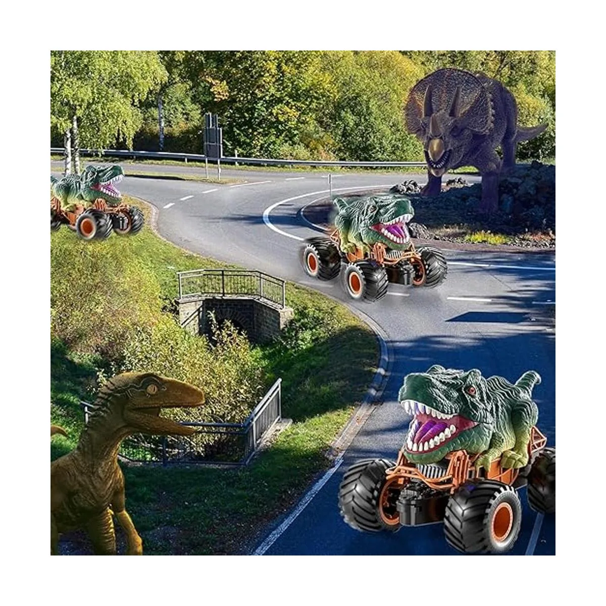 Potente control remoto de 2.4 GHz: el camión de dinosaurio funciona en la banda de frecuencia independiente de 2.4 GHz sin ninguna interferencia y control de larga distancia de aproximadamente 50 pies. Cada camión de dinosaurio de control remoto tiene una señal independiente de que varios camiones de dinosaurio se pueden controlar de forma remota al mismo tiempo. Apoya a un grupo de niños a sostener el juego de carreras sin interferencias.