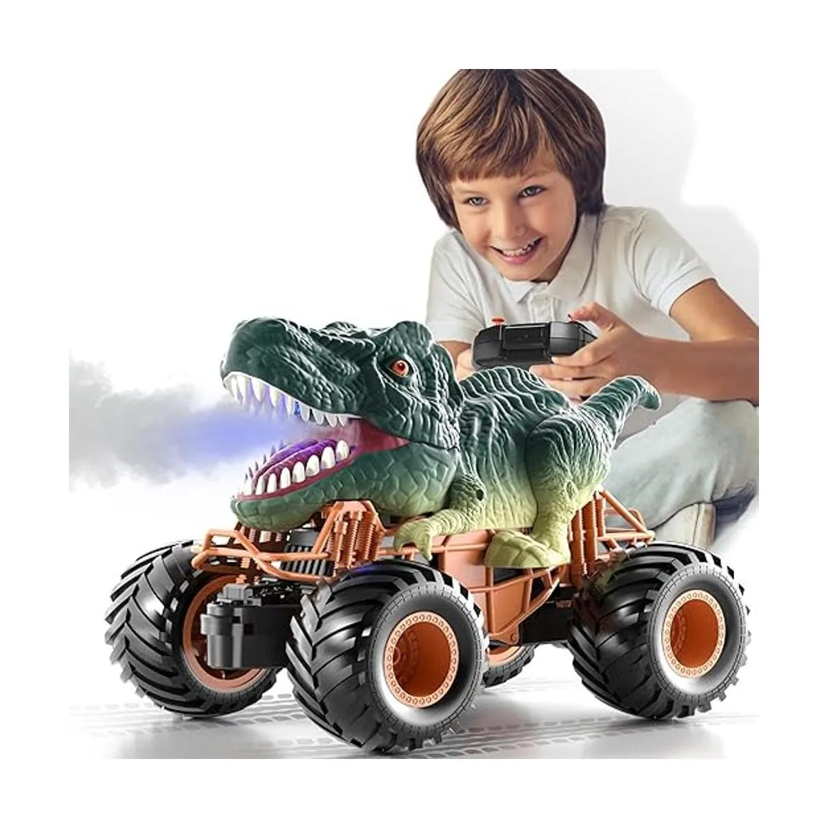 Combina los dinosaurios favoritos de los niños con elementos de carrera: el camión de dinosaurio de control remoto tiene funciones de dinosaurio y juguete de carreras, dos deseos se pueden cumplir al mismo tiempo. El camión de dinosaurios tiene el aspecto de un tiranosaurio violento. El efecto de sonido azul y dinosaurio iluminado LED viven este camión RC mientras juegas en interiores y exteriores. Los niños pueden añadir un poco de agua en la cabeza del camión de dinosaurios y presionar el botón de pulverización en el control remoto, luego escupirá llama de su boca abierta.