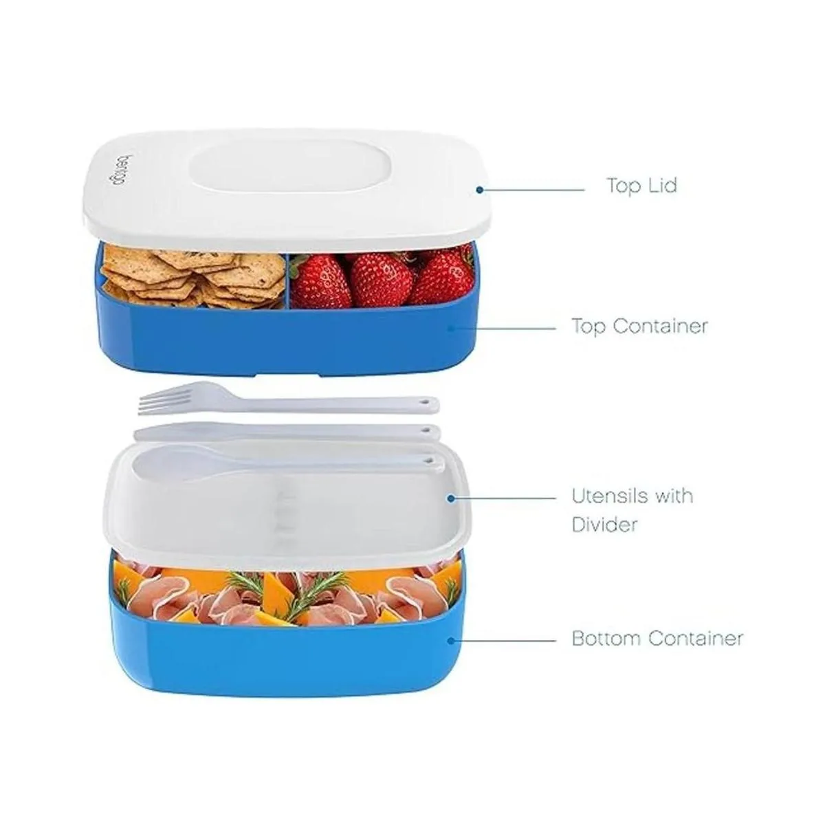 2 recipientes apilables: el recipiente superior cuenta con 2 compartimentos que cada uno tiene capacidad para 3/4 tazas de alimentos, mientras que el recipiente inferior tiene capacidad para 2 tazas, juntos son perfectos para empacar una variedad de alimentos en porciones saludables