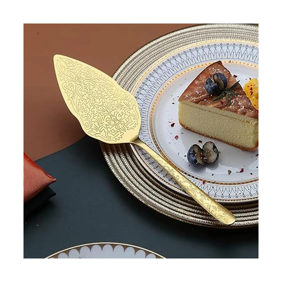Berglander Juego de cuchillos y servidor para pastel de boda dorado, chapado en oro de titanio con diseño de patrón único, juego de cortador de pasteles perfecto para bodas, cumpleaños, fiestas y eventos, apto para lavavajillas