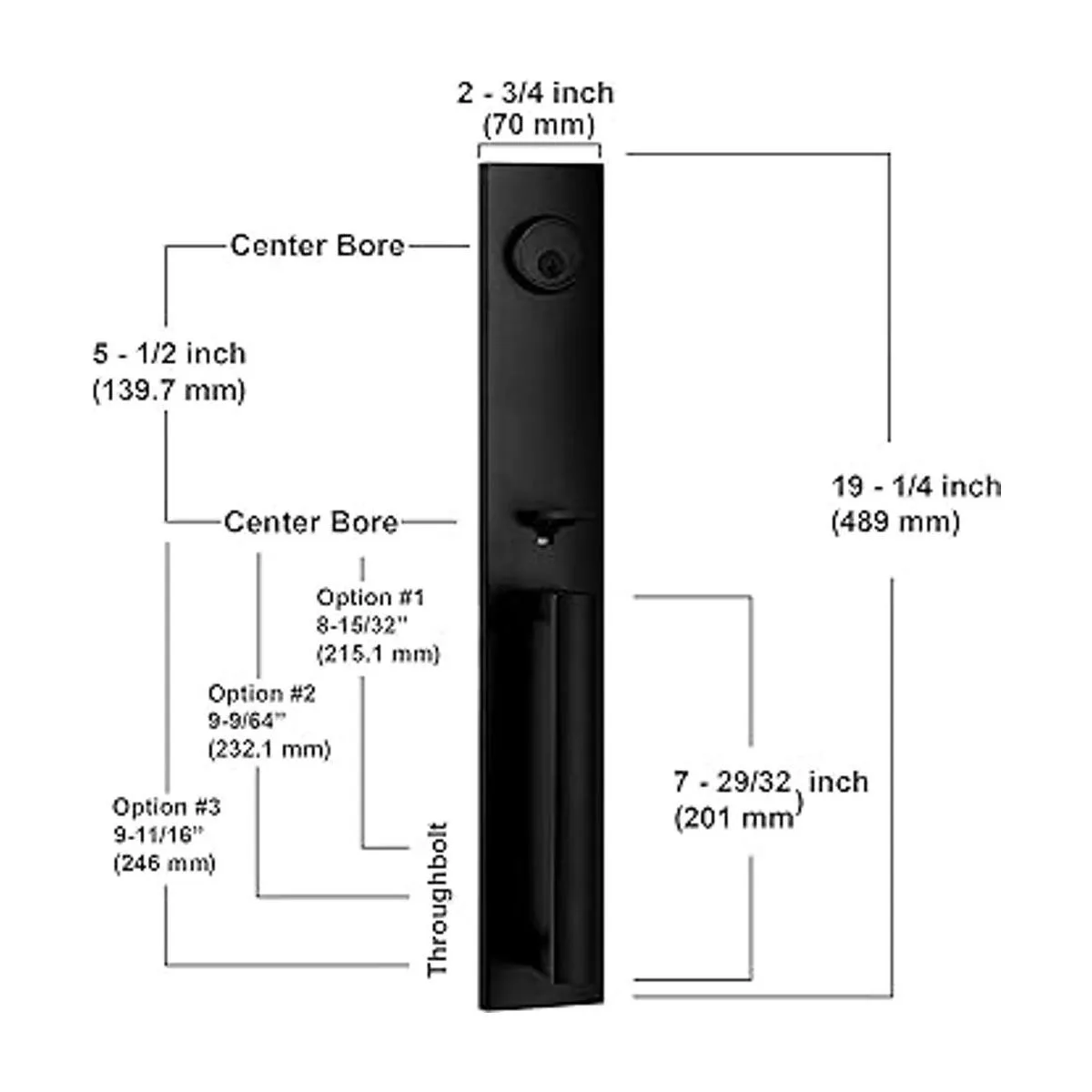El agujero del agujero del cerrojo y el agujero del mango deben estar de 51/2 pulgadas de distancia para una instalación adecuada. Juego de manijas de puerta delantera opcional a través de ajustes de perno para una instalación sin preocupaciones.
