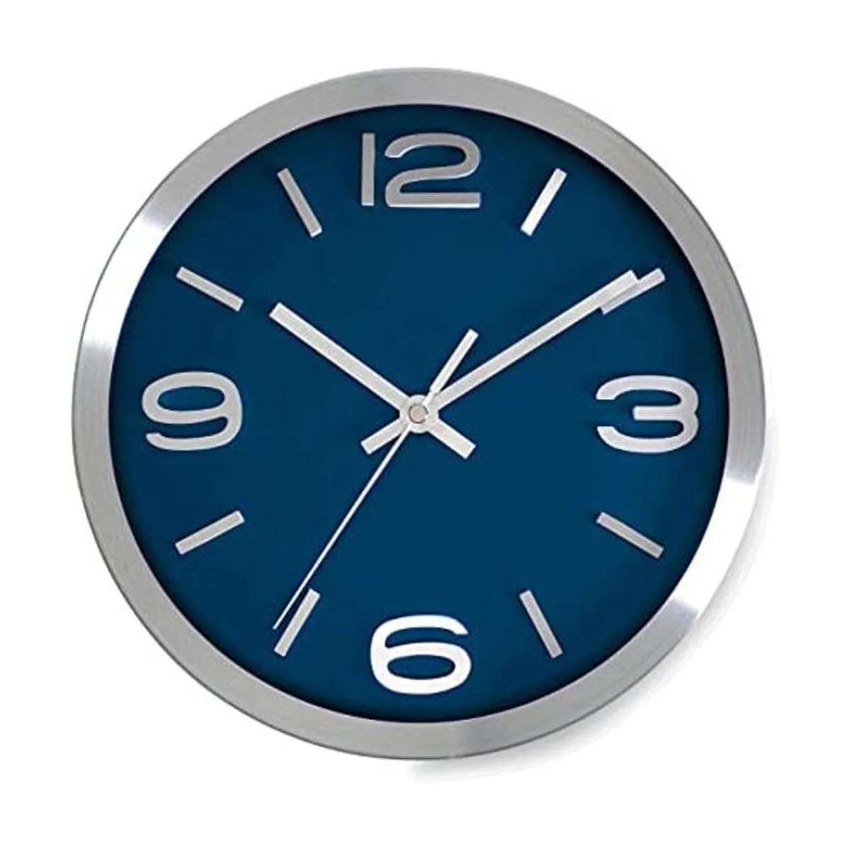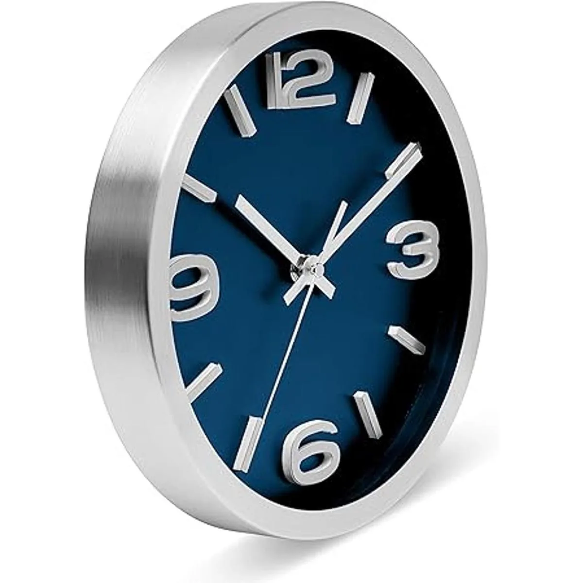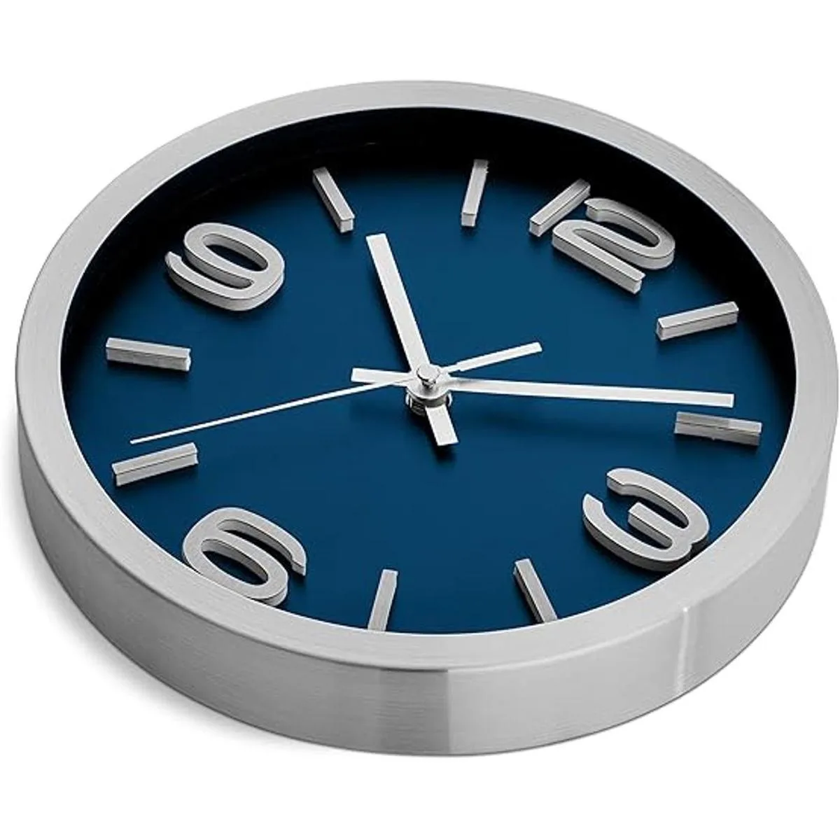 Exquisito reloj de pared plateado cepillado con detalle de número 3D. La manecilla plateada de hora, minutos y segundos complementan el marco y los números y destacan sobre el fondo azul oscuro
