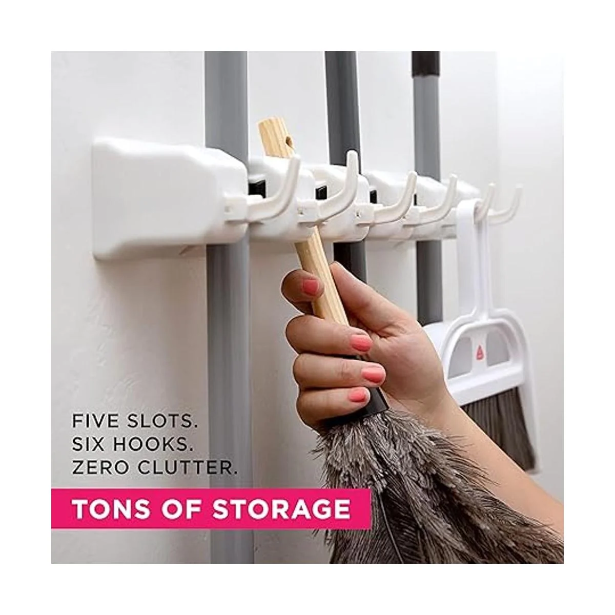 Del desorden a la decoración en el hogar: si tienes suministros de limpieza que ocupan tu baño, cocina o cochera, ordénalos con este sistema de organización. Con 11 puntos de almacenamiento en total 5 ranuras para escobas y trapeadores y 6 ganchos adicionales, este soporte para escobas para montar en la pared ahorra espacio y mantendrá todo perfectamente en su lugar.