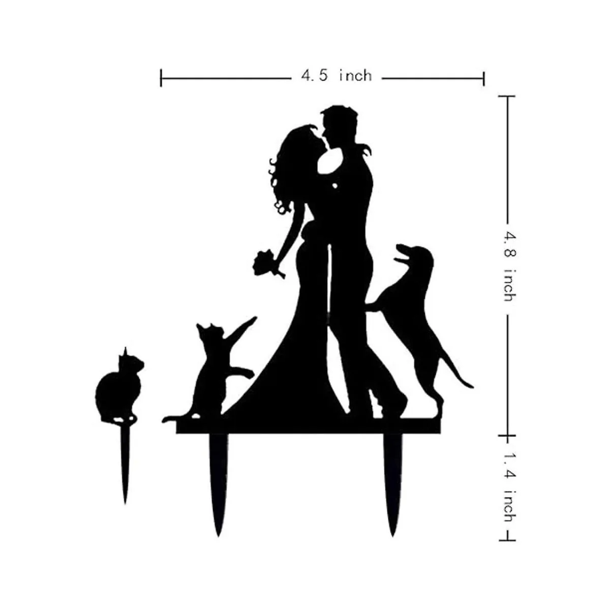 Besando novia y novio con gato y perro silueta boda acrílico pastel Topper negro