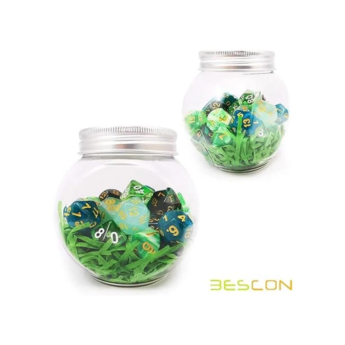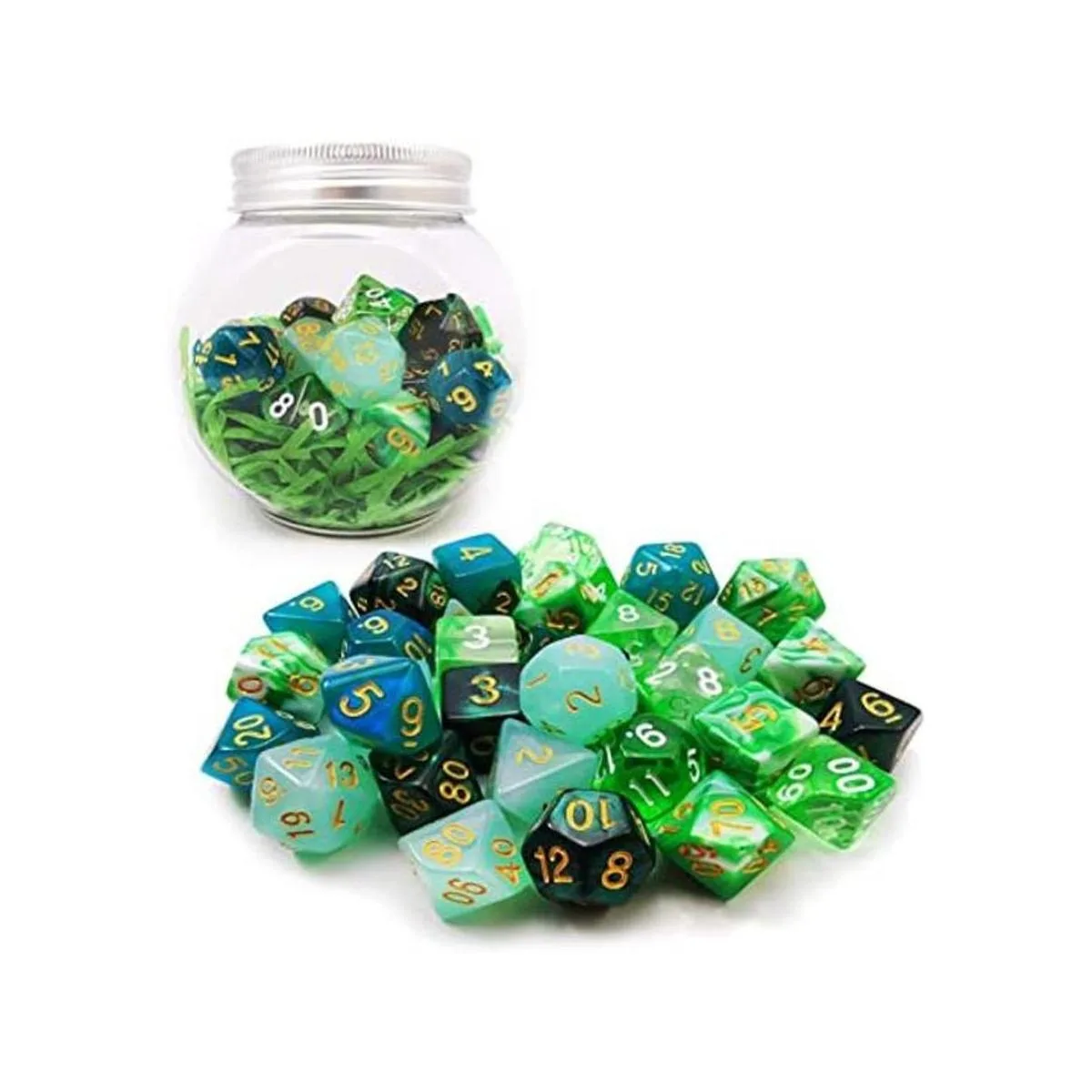 El juego de dados contiene 35 dados poliédricos en tamaño estándar: 35 dados de 5 juegos y 7 dados cada uno. Son cristales, en capas, remolinos, dados de piedra lunar en diferentes tonos verdes. Todos tienen su propio carácter.