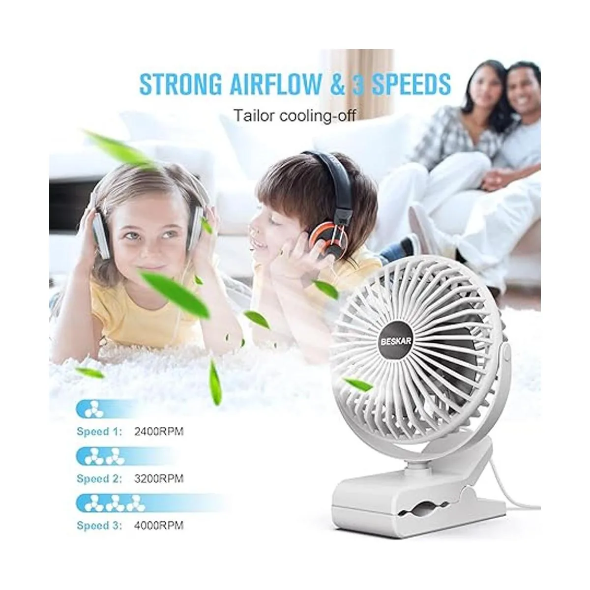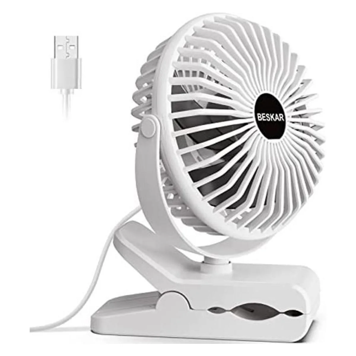 BESKAR Ventilador de clip alimentado por USB, rotación de 360 silencioso ventilador de cochecito de bebé con fuerte flujo de aire, ventilador pequeño portátil de 3 velocidades con abrazadera resistente, ventilador de refrigeración personal perfecto para oficina, mesa, dormitorio, cocina