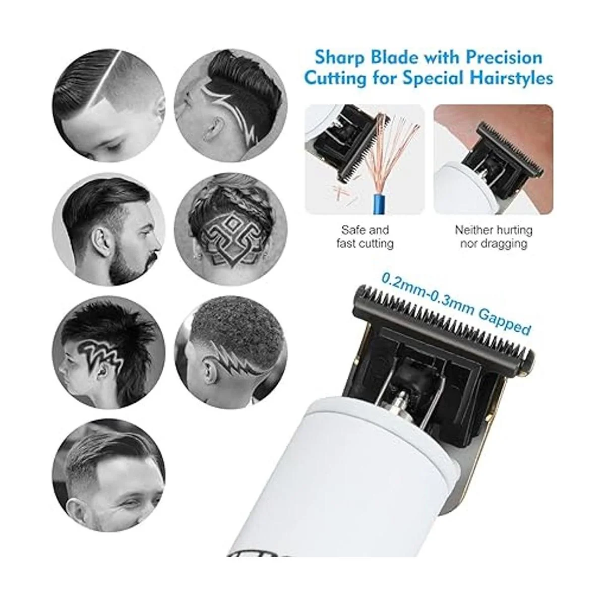Nivel de cinta ajustable y peine de guía La unidad ligera de carcasa hace que las cortadoras de pelo profesionales sean fáciles de usar. Ajusta fácilmente la longitud de corte con el nivel de cono integrado de 1 a 0.118 in de longitud, y 6 peines límite de longitud estándar respectivamente de 0.059 in, 0.177 in, 0.118 in, 0.236 in, 0.354 in, 0.512 in. El recortador detallado está equipado con 4 peines guía 0.039 in, 0.059 in, 0.079 in, 0.118 in. Puedes ajustar fácilmente el peine a la altura correcta y cortar el peinado que desees.