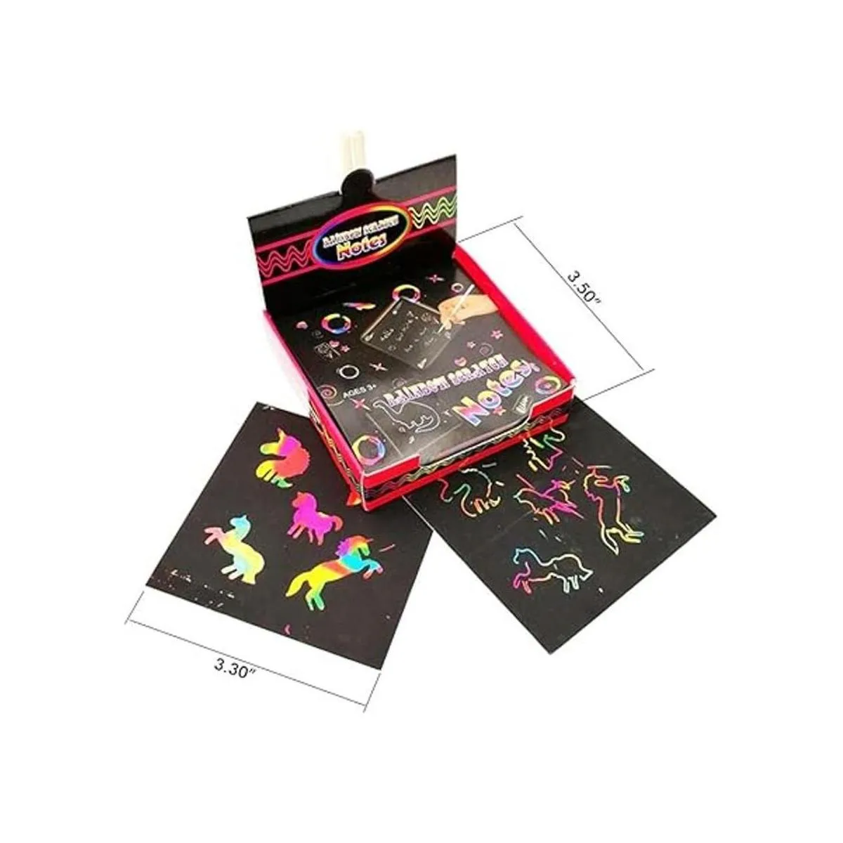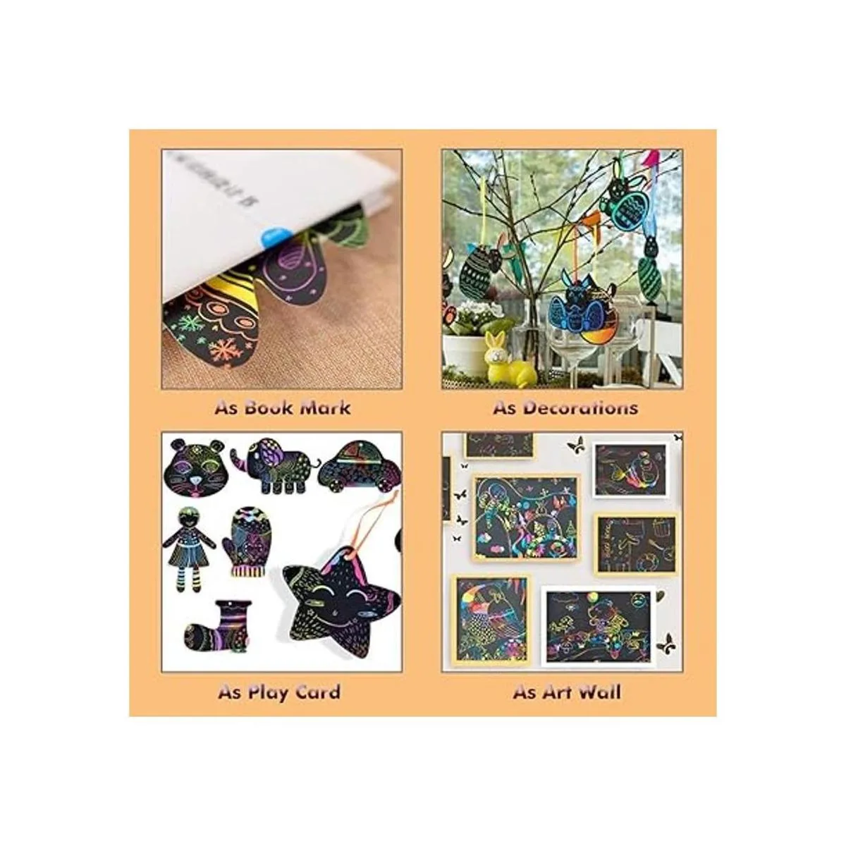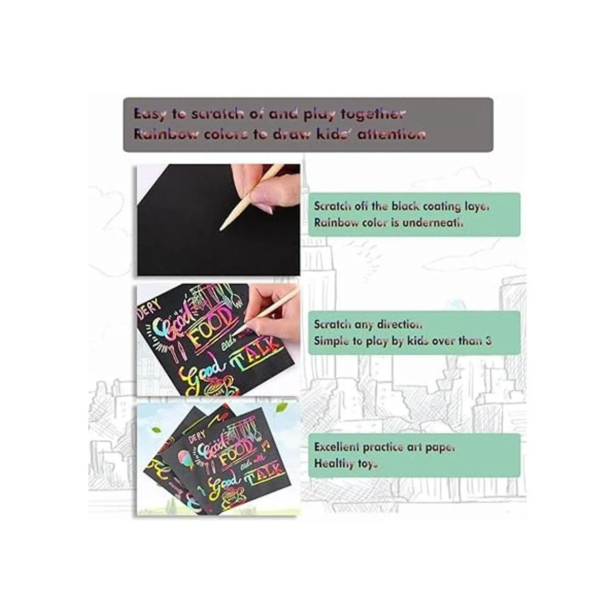 Fácil de rascar: páginas negras hechas con papel de gran calidad, que no es fácil de rasgar con colores arcoíris, blanco plateado/negro y todo en páginas negras y rascar la capa negra del revestimiento con rascador de madera incluido para revelar diferentes colores debajo, lo que es fácil de rayar incluso por niños de 3 años.