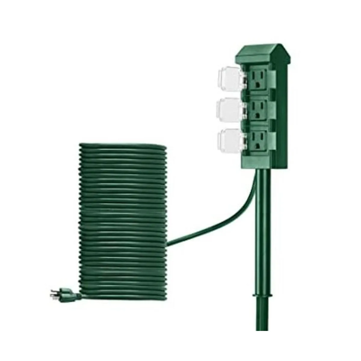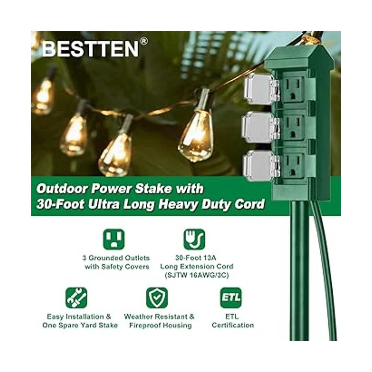 BESTTEN Estaca de alimentación para exteriores con cable de extensión ultra largo de 30 pies, regleta de alimentación de 3 salidas con cubiertas protectoras resistentes a la intemperie, listado ETL, verde