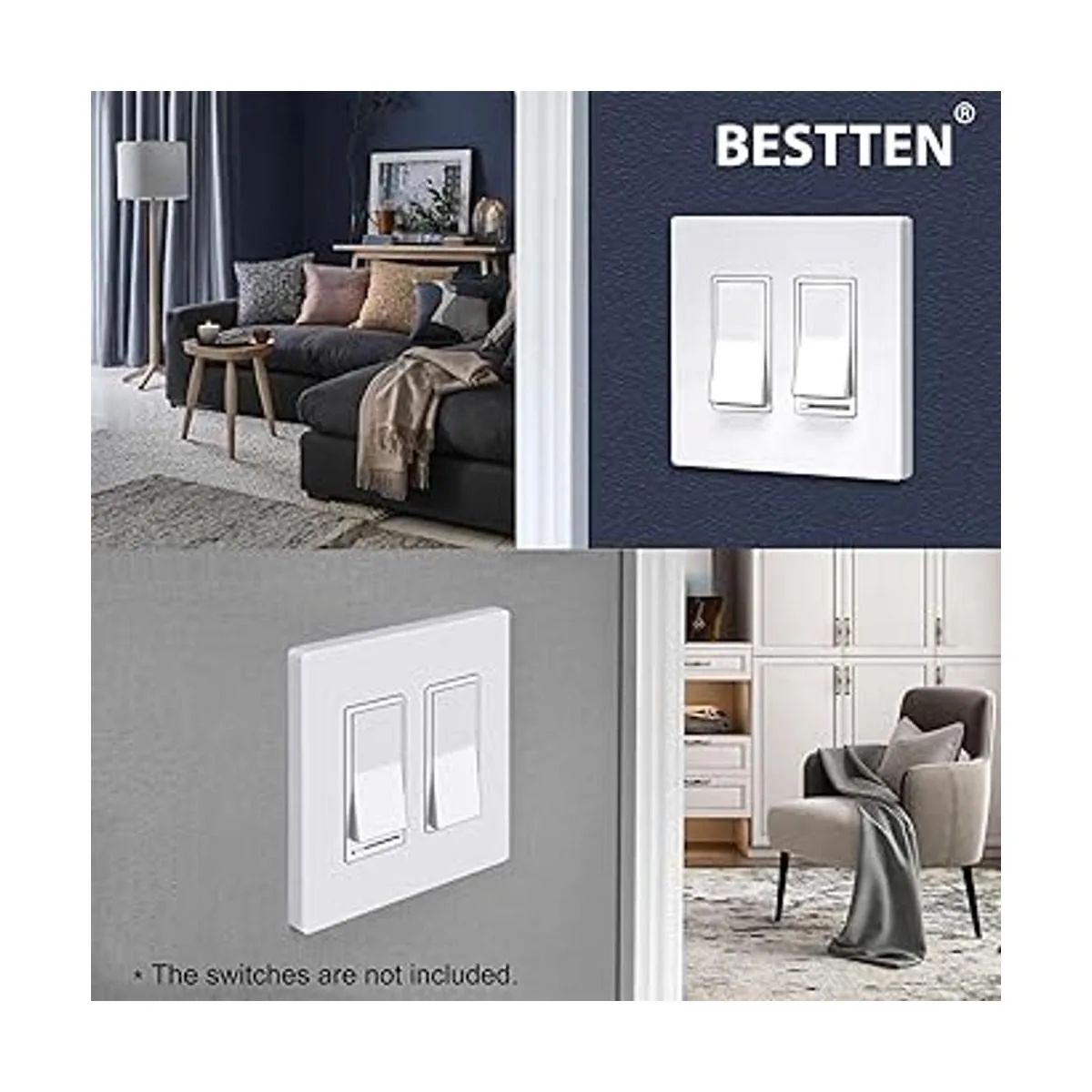 BESTTEN Paquete de 10 platos de pared sin tornillos de 2 bandas, serie USWP6 Blancanieves, cubierta de salida de decorador, 4.69 pulgadas de alto x 4.73 pulgadas de ancho, para interruptor de luz, regulador, GFCI, receptáculo USB
