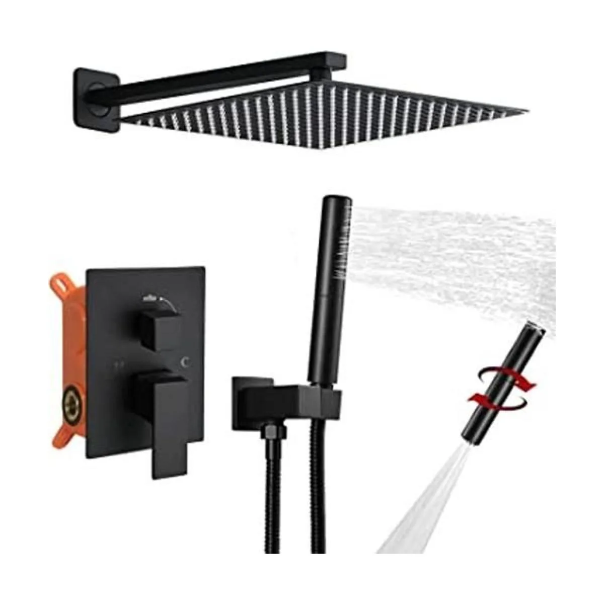 El kit incluye todo lo que necesitas para tener la mejor experiencia de ducha: un cabezal de pared, fijo y cuadrado de 12 pulgadas en acero inoxidable 304, un cabezal manual multifunción 2 en 1 con pulverizador en latón, una varita manual de 16 pulgadas en latón, una manguera de ducha de 59 pulgadas en acero inoxidable, un soporte en latón y un aplique de grifo para pared en latón.
