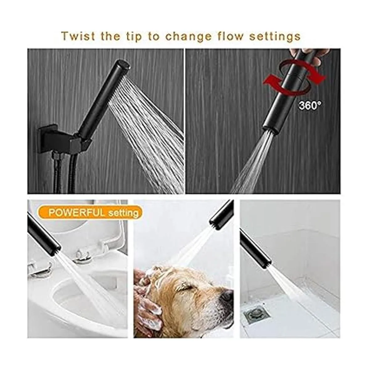 El cabezal manual que se encuentra en la ducha tiene múltiples funciones. Es un 2 en 1 muy diferente de los otros y se incluye en el sistema de ducha. Sólo debes girar el cuerpo para cambiar de modo de ducha a modo de de repuesto, el cual se utiliza extensivamente para limpiar y duchar las mascotas.