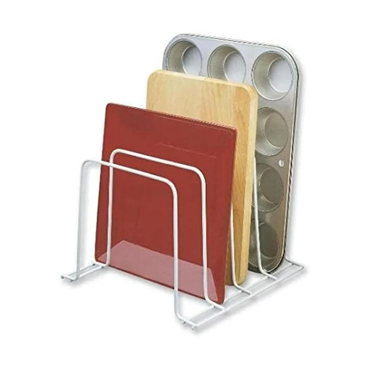 Kitchen Organizing Rack This organizer is perfect for the kitchen, as the four divider slots keep items like cutting boards, muffin pans, or serving trays close at hand