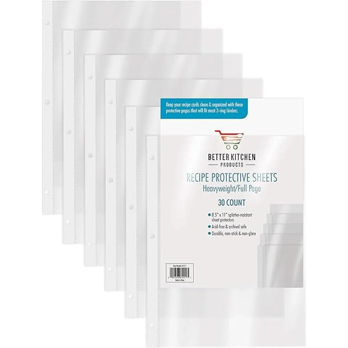 Better Kitchen Products, protectores de hojas de recetas de página completa, 8.5 x 11 pulgadas, paquete de 30 unidades, peso pesado, carga superior, hojas de carpeta protectoras, 3 agujeros perforados, para carpetas de recetas, paquete de 30 unidades
