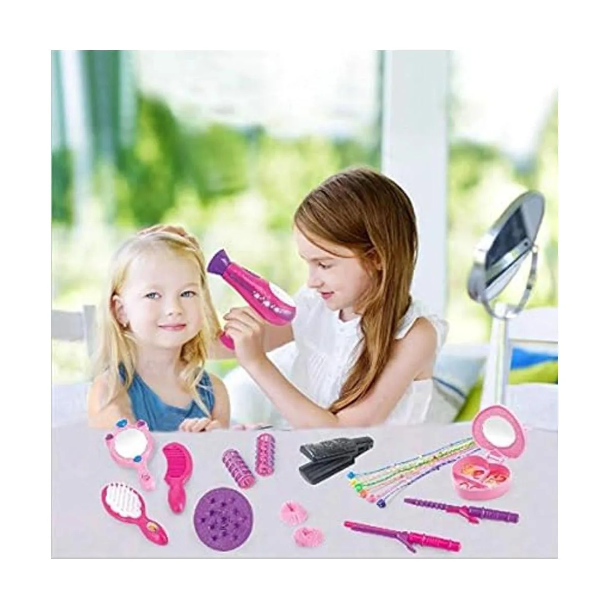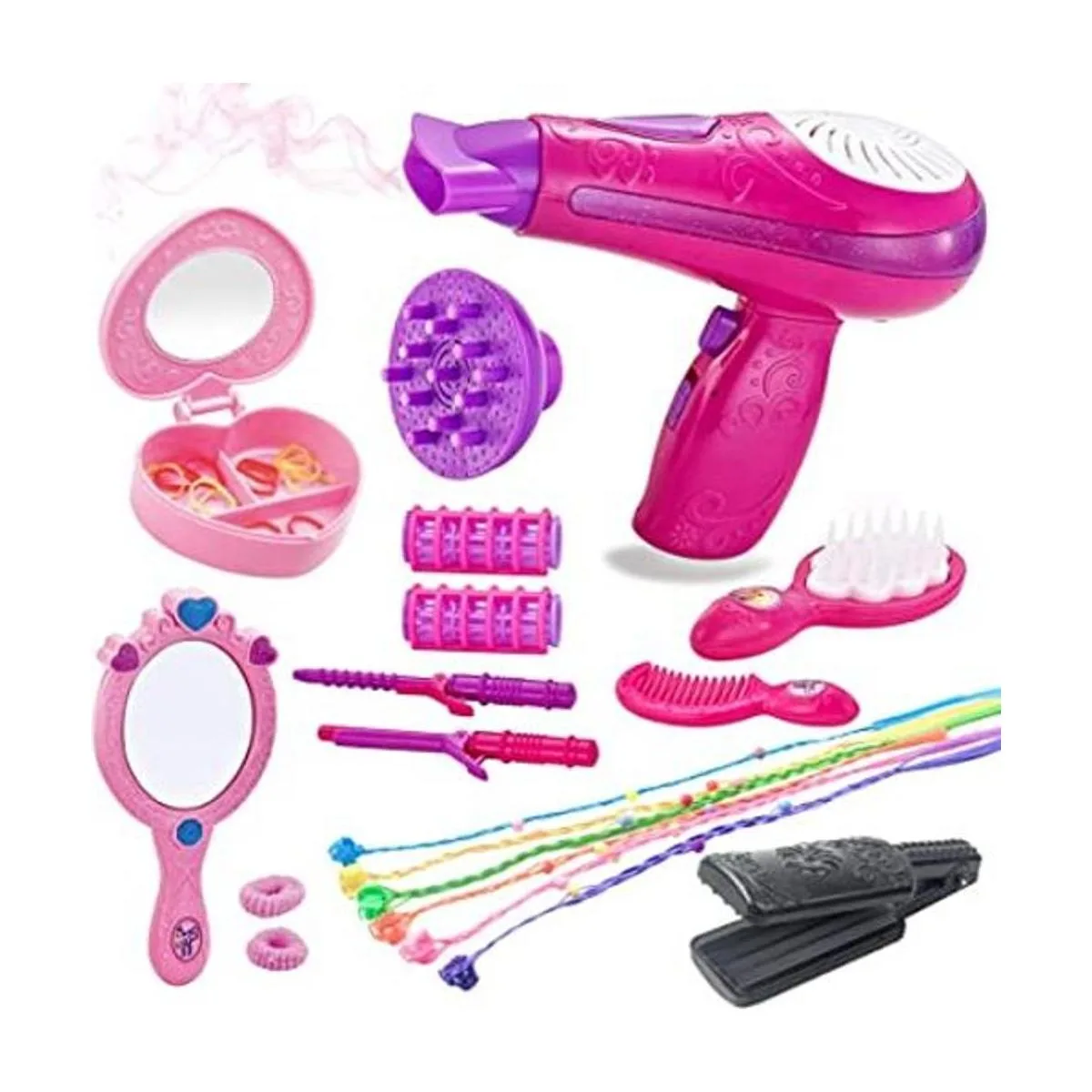 BETTINA Kit de juguetes de peluquería de belleza para niñas pequeñas con secador de pelo de juguete, espejo y otros accesorios, juego de maquillaje de moda para niños