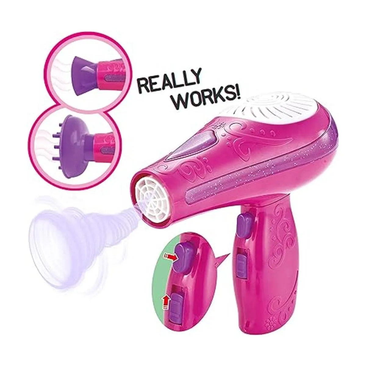 Secadora de trabajo y herramientas realistas: este elegante juego de estilista de belleza incluye todas las herramientas y accesorios que las niñas necesitan para jugar al salón de belleza princesa en casa o en la escuela. El secador de pelo realmente sopla aire frío y requiere dos 1.5VLR6 no incluidas