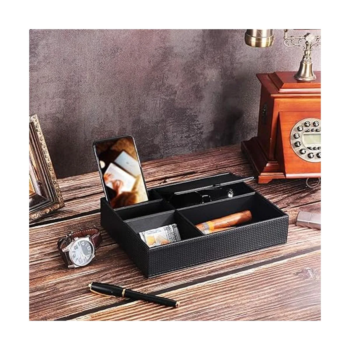 BEWISHOME Bandeja de valet para hombre, organizador de mesita de noche, accesorios para hombres, joyas, cuero sintético de fibra de carbono, color negro SSH06C