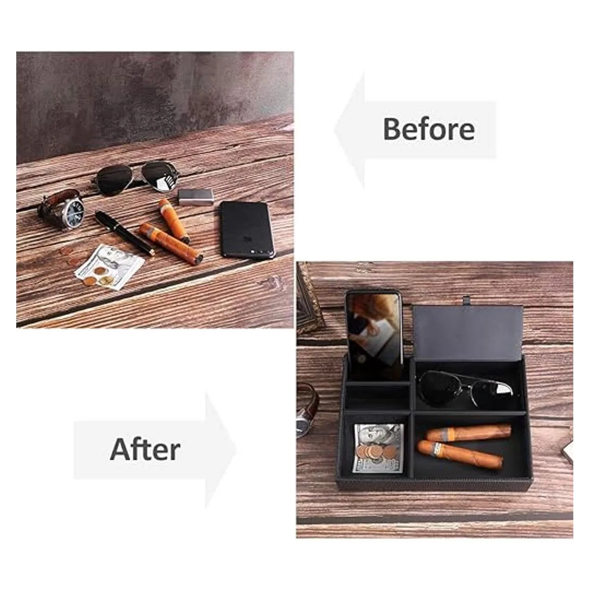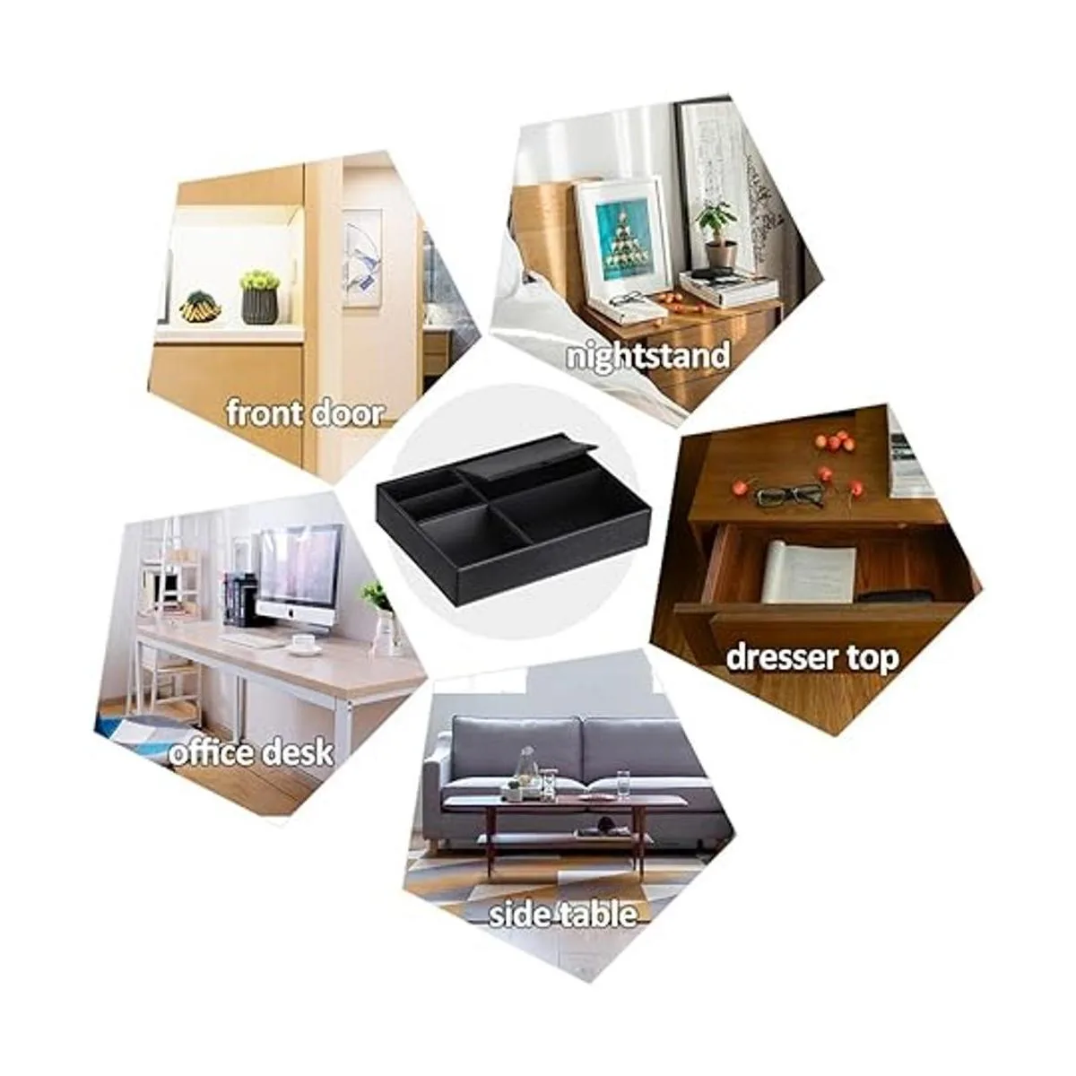 Compañero perfecto para mesita de noche: No quieres que las cosas se extiendan toda la mesita de noche Evita que tus cosas se caigan al suelo Deseas buscando cosas por la mañana Esta bandeja de valet será una solución para ti. Un compartimento curvado para monedas, un compartimento cerrado perfecto para gafas de sol, un compartimento abierto ideal para una cartera y dos compartimentos pequeños para teléfonos. Esta bandeja de joyería funcionará muy bien para organizar artículos cerca de la cama