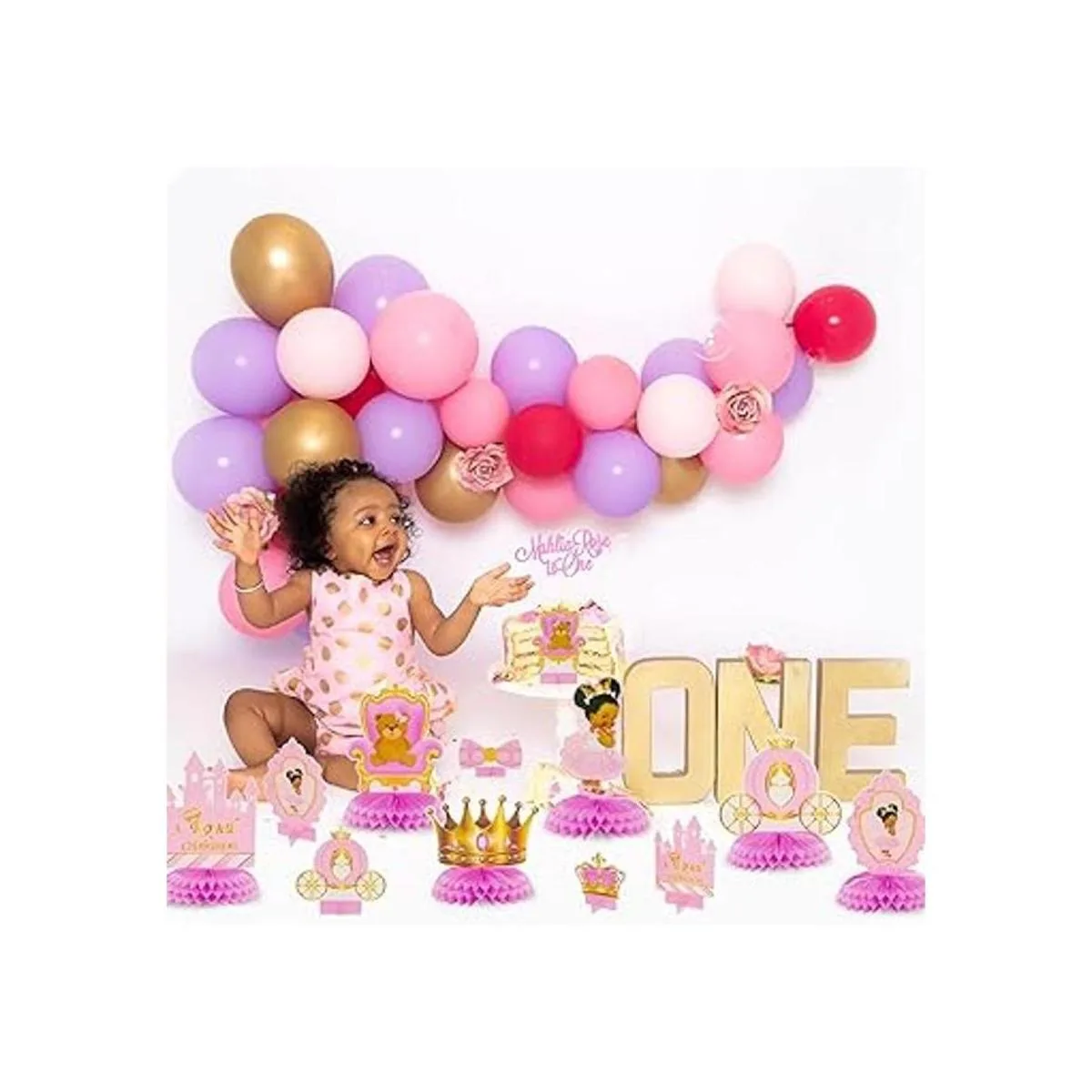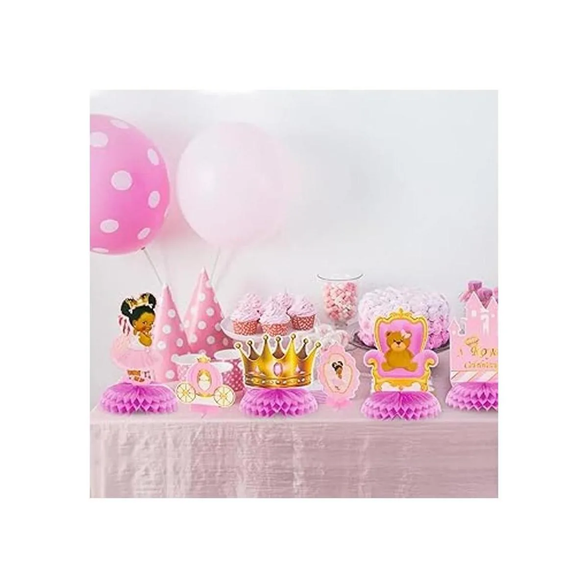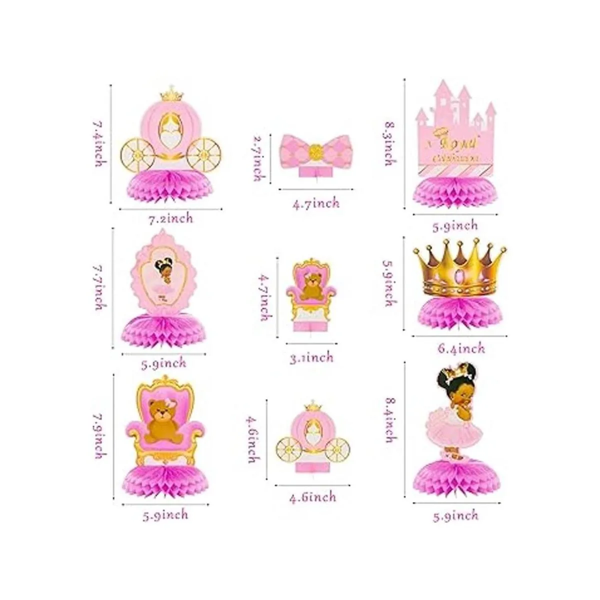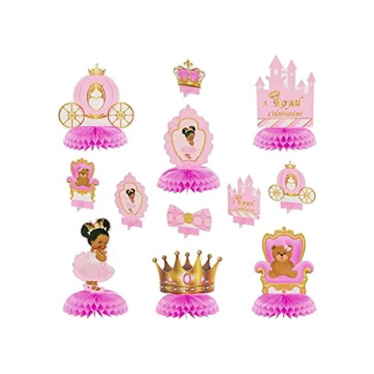 BeYumi 12 piezas de decoración de panal con temática de princesa real para bebés y niñas, afroamericana, pequeña princesa negra, castillo, tiara rosa y dorada, suministros de fiesta de cumpleaños