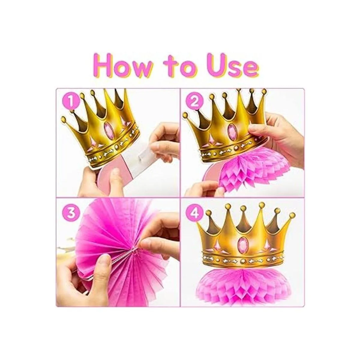 Contenido del paquete: hay 6 centros de mesa de panal con temática de princesa de diferentes diseños, 6 decoraciones de escritorio y 1 punto de pegamento que no deja marcas en el paquete. Es fácil de montar y puede satisfacer tus diversas necesidades de decoración.