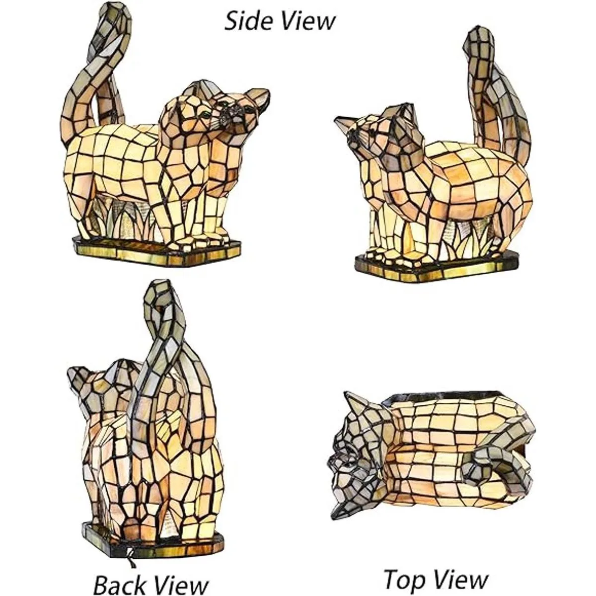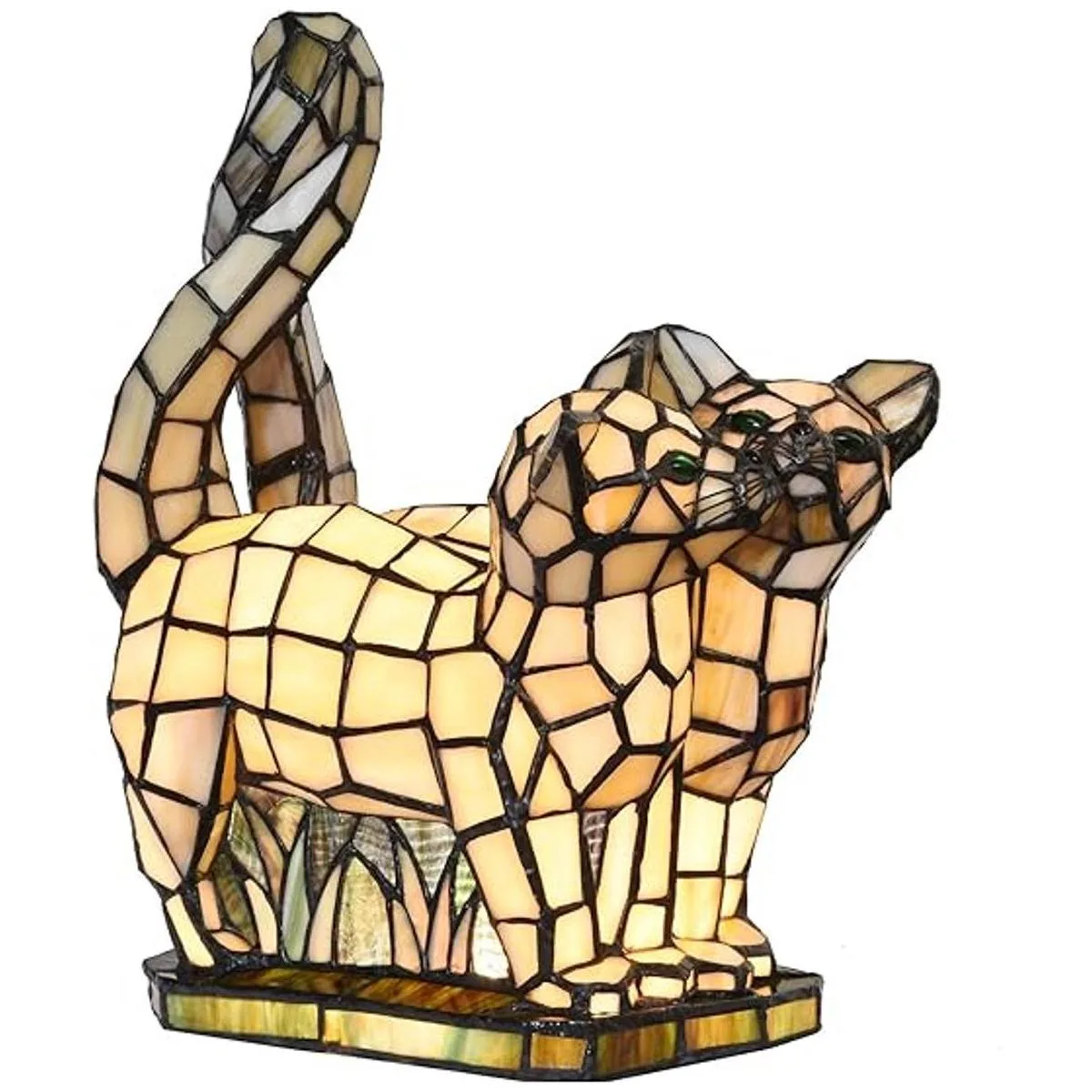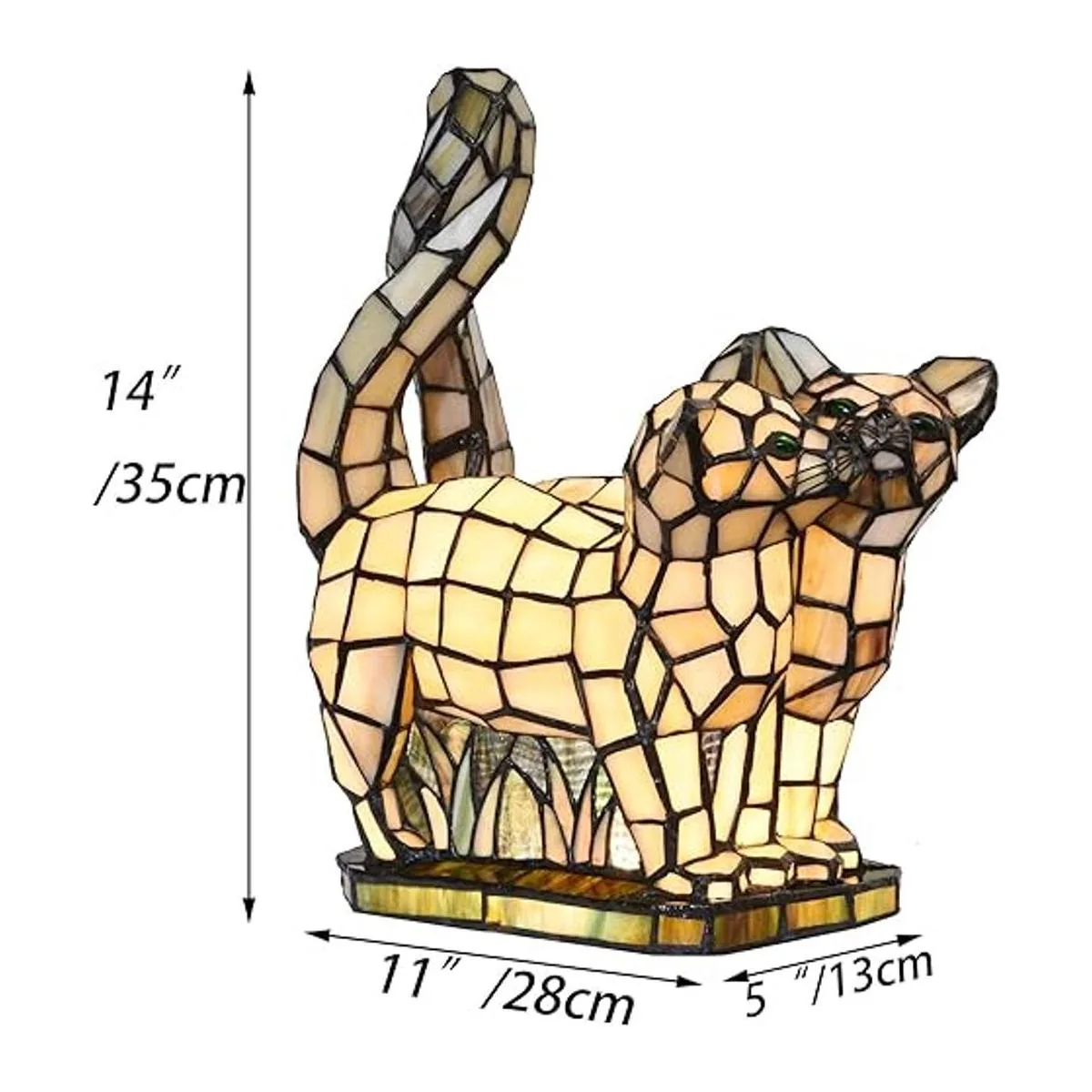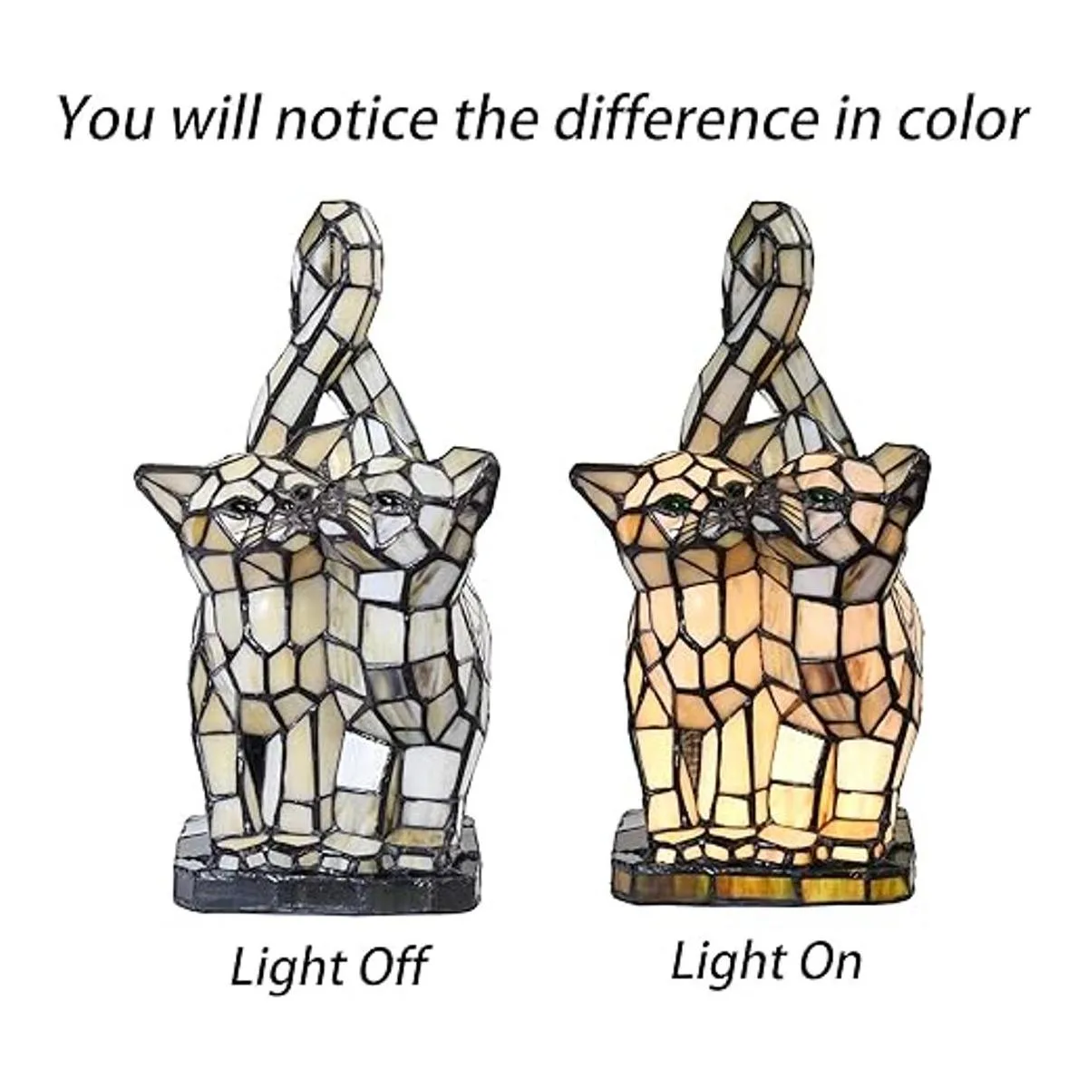 Bieye L10771 Lámpara de mesa con dos gatos en el amor, estilo Tiffany, cristal tintado, luz nocturna, para la noche, para la sala de estar, dormitorio, para amantes de los animales, 14 pulgadas de alto, color naranja