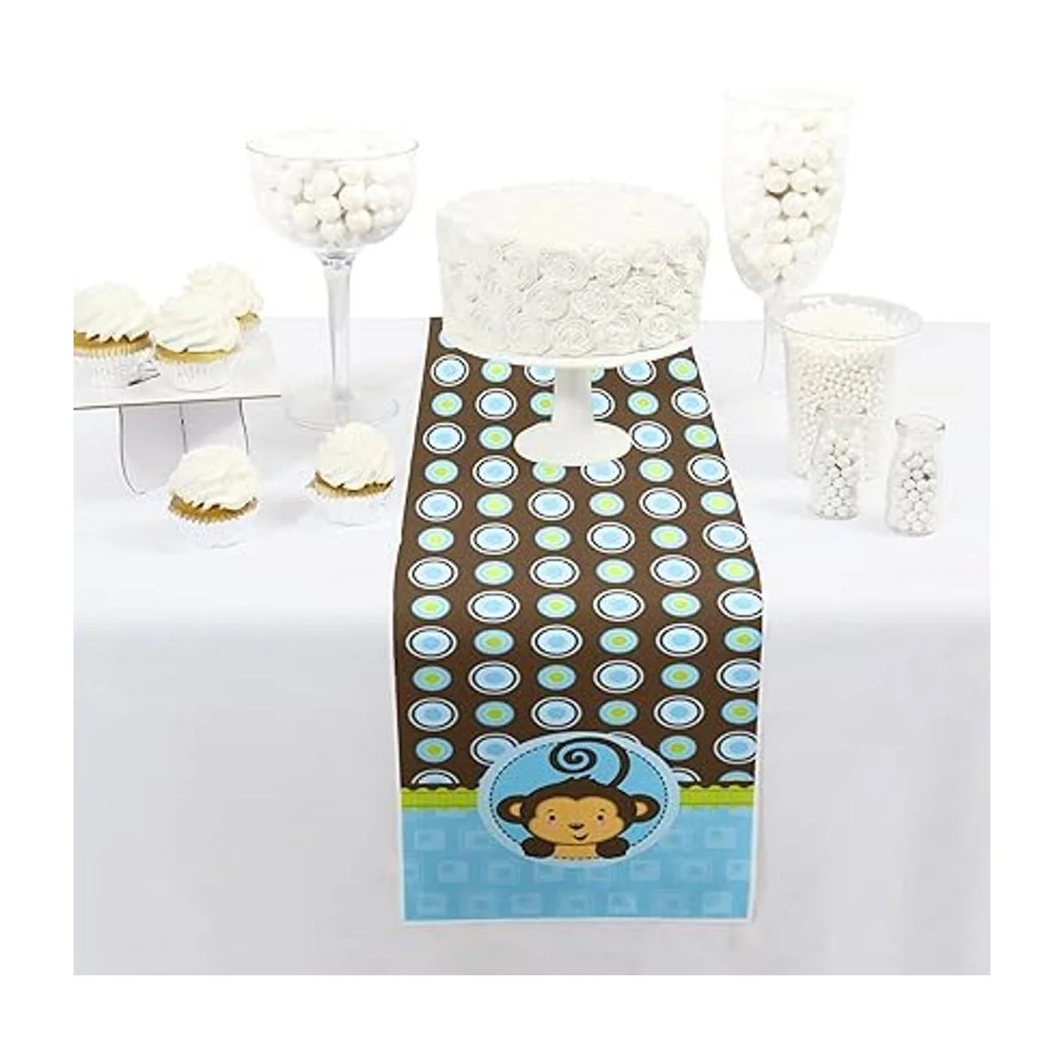El camino de mesa de papel Blue Monkey Boy es una decoración perfecta para fiestas de bienvenida de bebé o fiesta de cumpleaños para mesas de regalo, bufés de dulces o mesas de comedor.