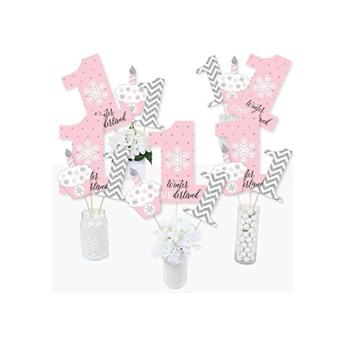 Big Dot of Happiness Pink Onederland Juego de 15 centros de mesa con copos de nieve para fiestas de primer cumpleaños